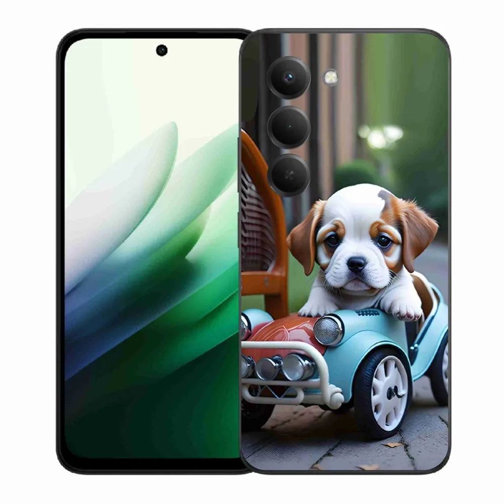 Psí pouzdro na Xiaomi Redmi 15 5G 169mm - štěně v retro autě poskytuje všechny výhody gelových obalů, a to v zajímavém designu.