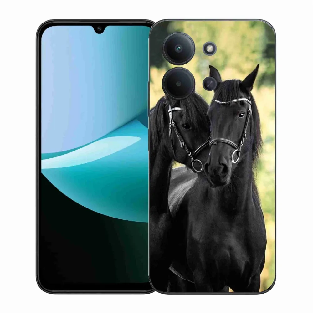 Pouzdro s motivem koní na Xiaomi Redmi 15C 4G (171mm)/Poco C85 4G (171mm) - dva černí koně poskytuje všechny výhody gelových krytů, a to v zajímavém designu.