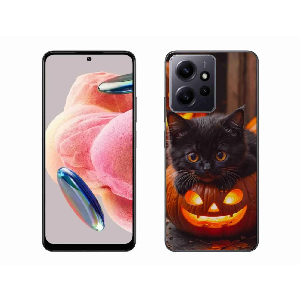 Kočičí pouzdro na Xiaomi Redmi Note 12 4G - kotě a dýně poskytuje všechny výhody gelových obalů, a to v zajímavém designu.