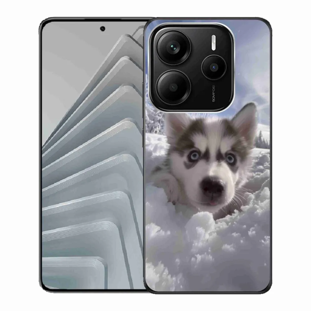 Psí pouzdro na Xiaomi Redmi Note 14 5G - husky ve sněhu poskytuje všechny výhody gelových obalů, a to v zajímavém designu.