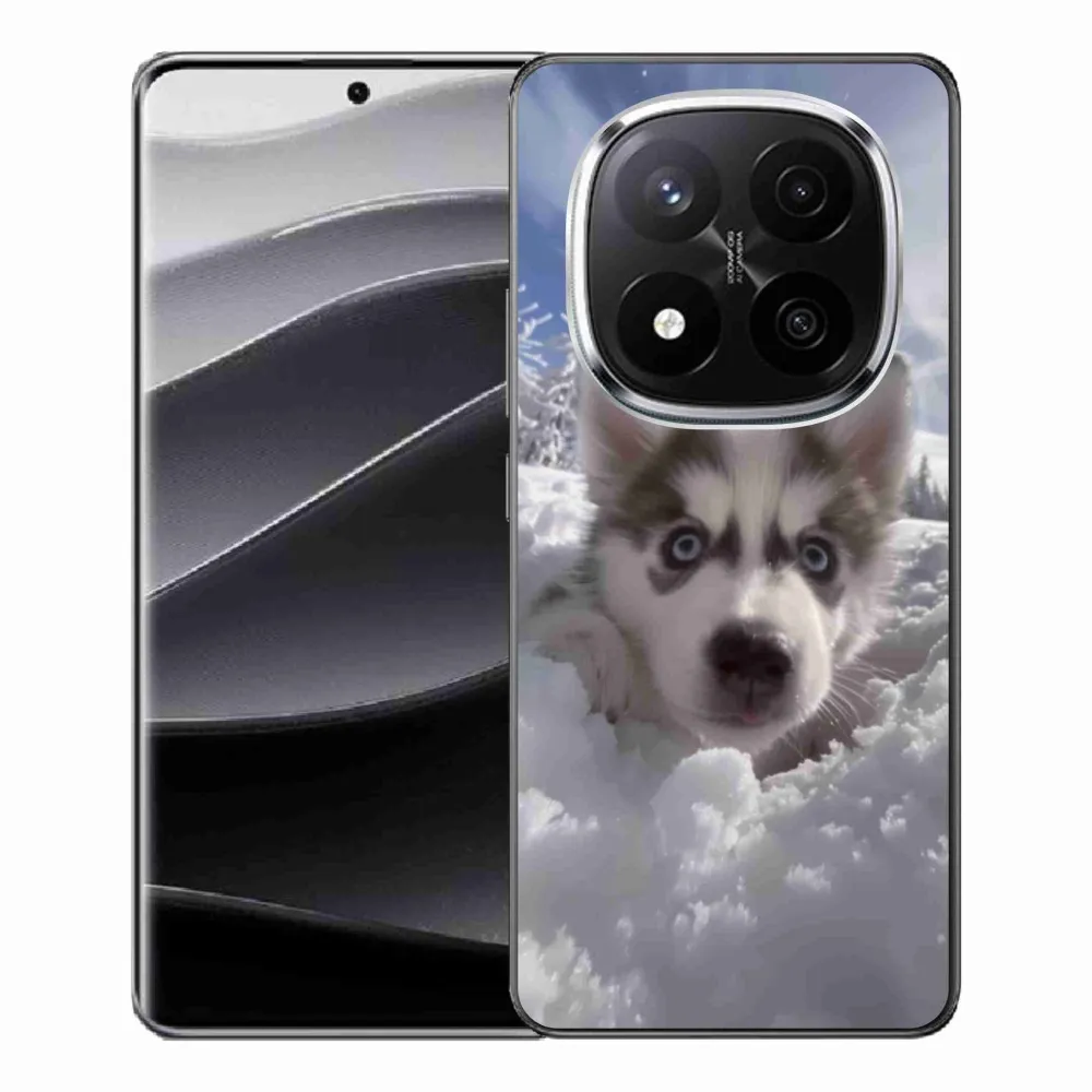 Psí pouzdro na Xiaomi Redmi Note 14 Pro+ 5G - husky ve sněhu poskytuje všechny výhody gelových obalů, a to v zajímavém designu.