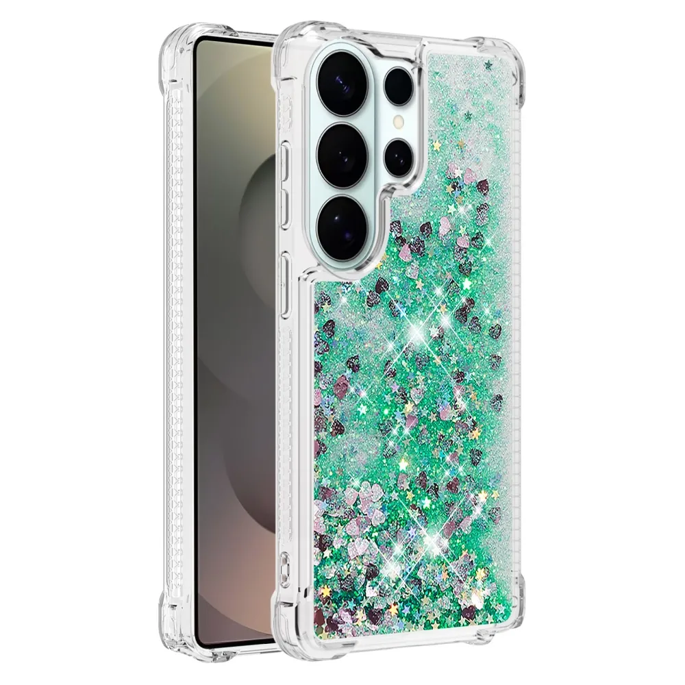 Glitter přesýpací gelový obal na Samsung Galaxy S26 Ultra - zelený/srdíčka