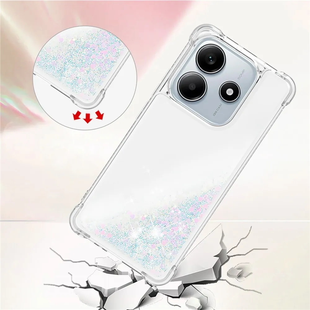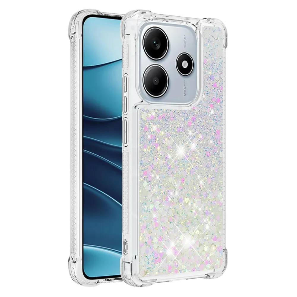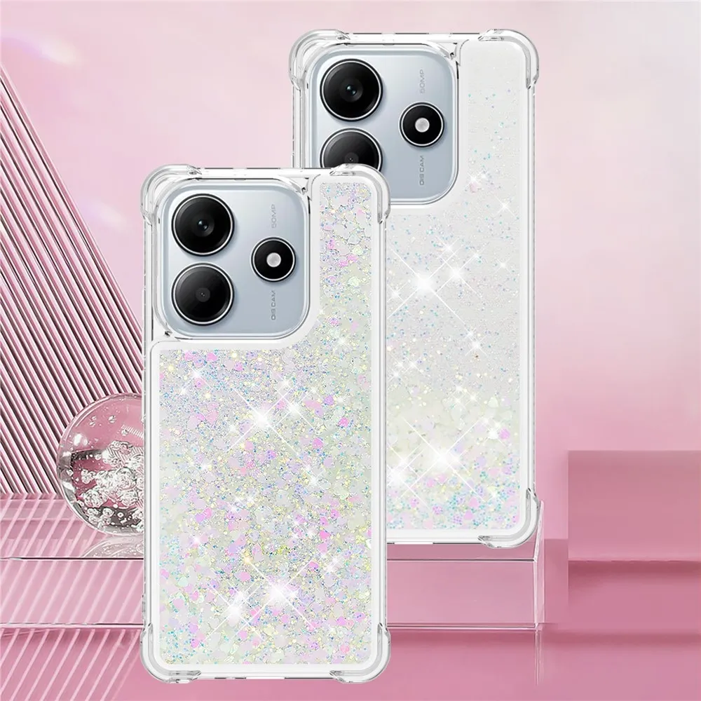 Glitter přesýpací gelový obal na Xiaomi Redmi Note 14 5G - růžovostříbrný/srdíčka