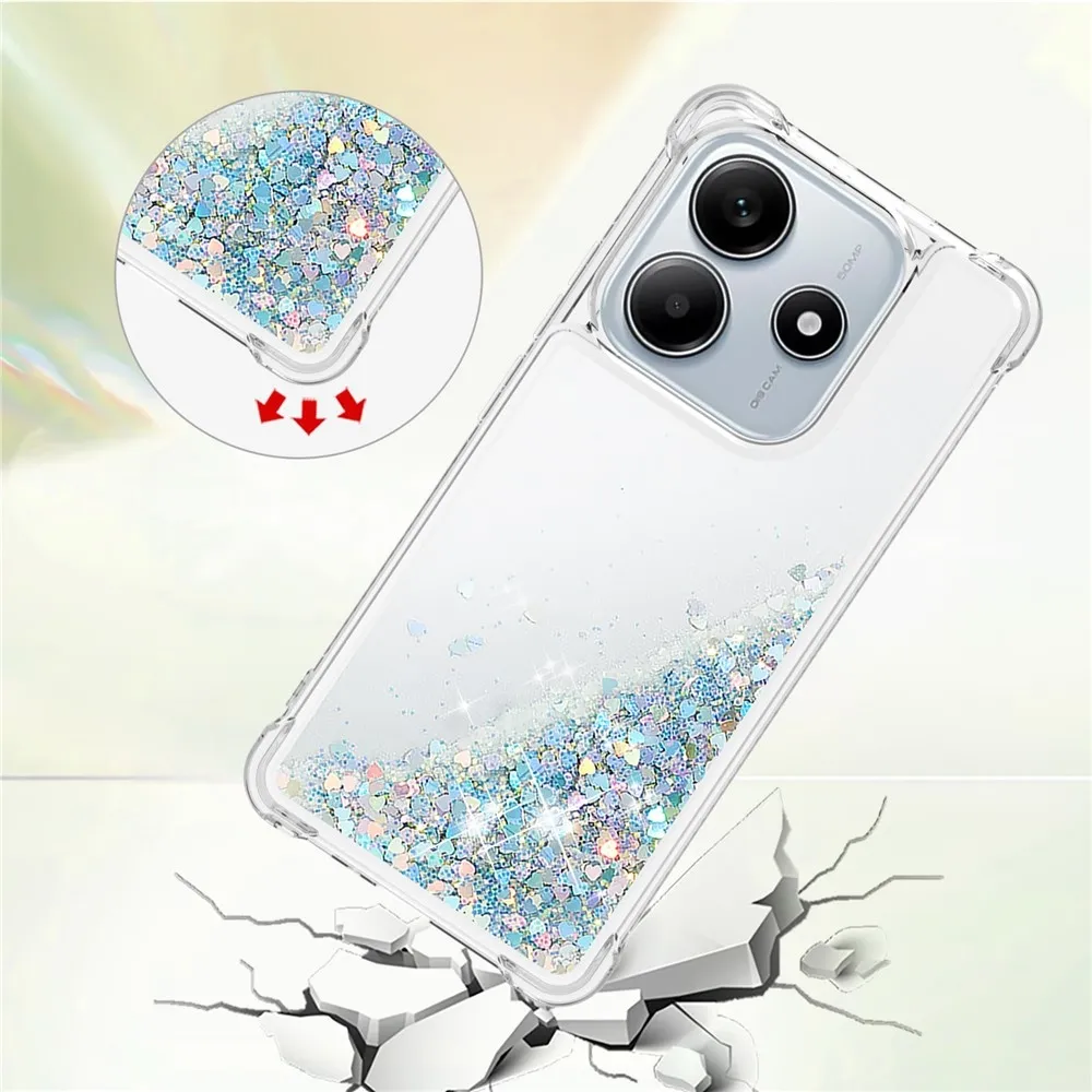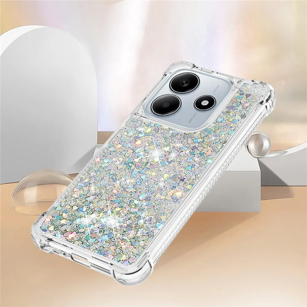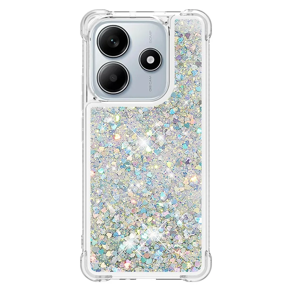 Glitter přesýpací gelový obal na Xiaomi Redmi Note 14 5G - stříbrný/srdíčka