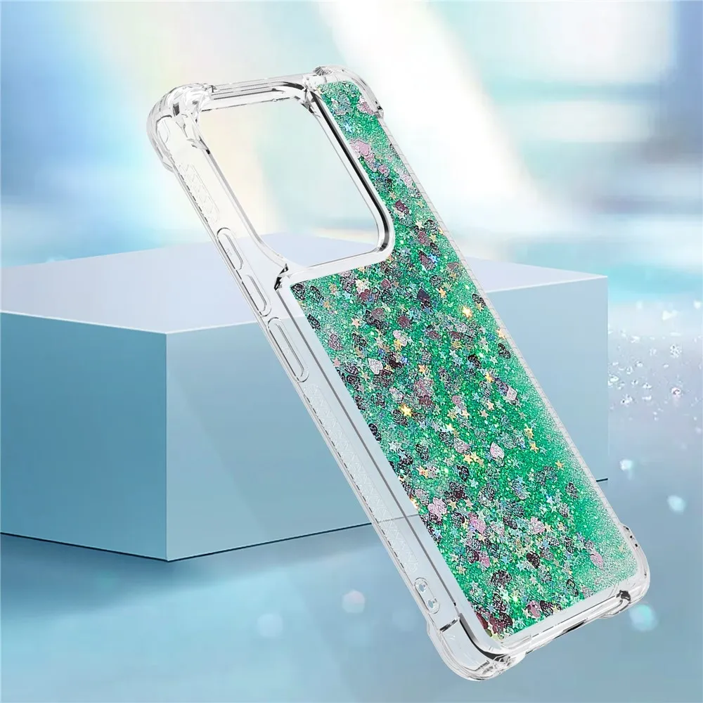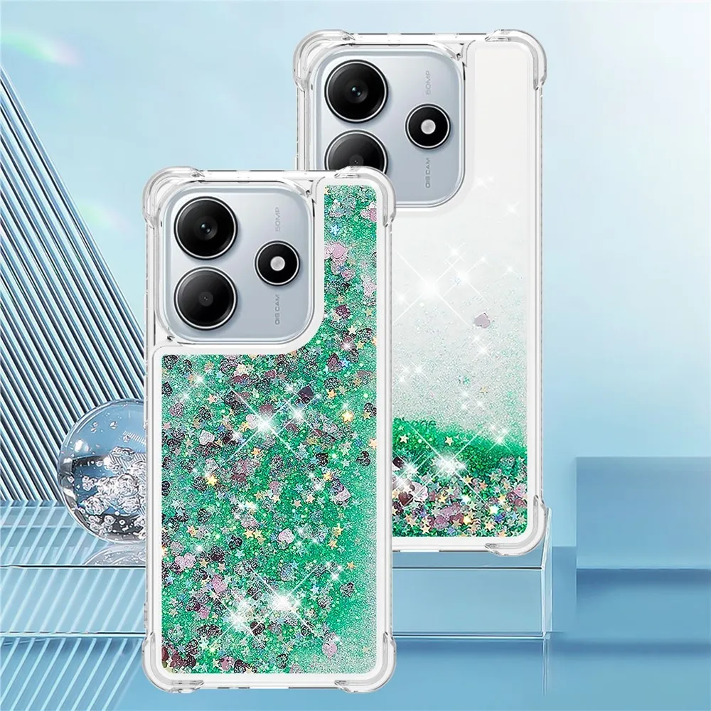 Glitter přesýpací gelový obal na Xiaomi Redmi Note 14 5G - zelený/srdíčka