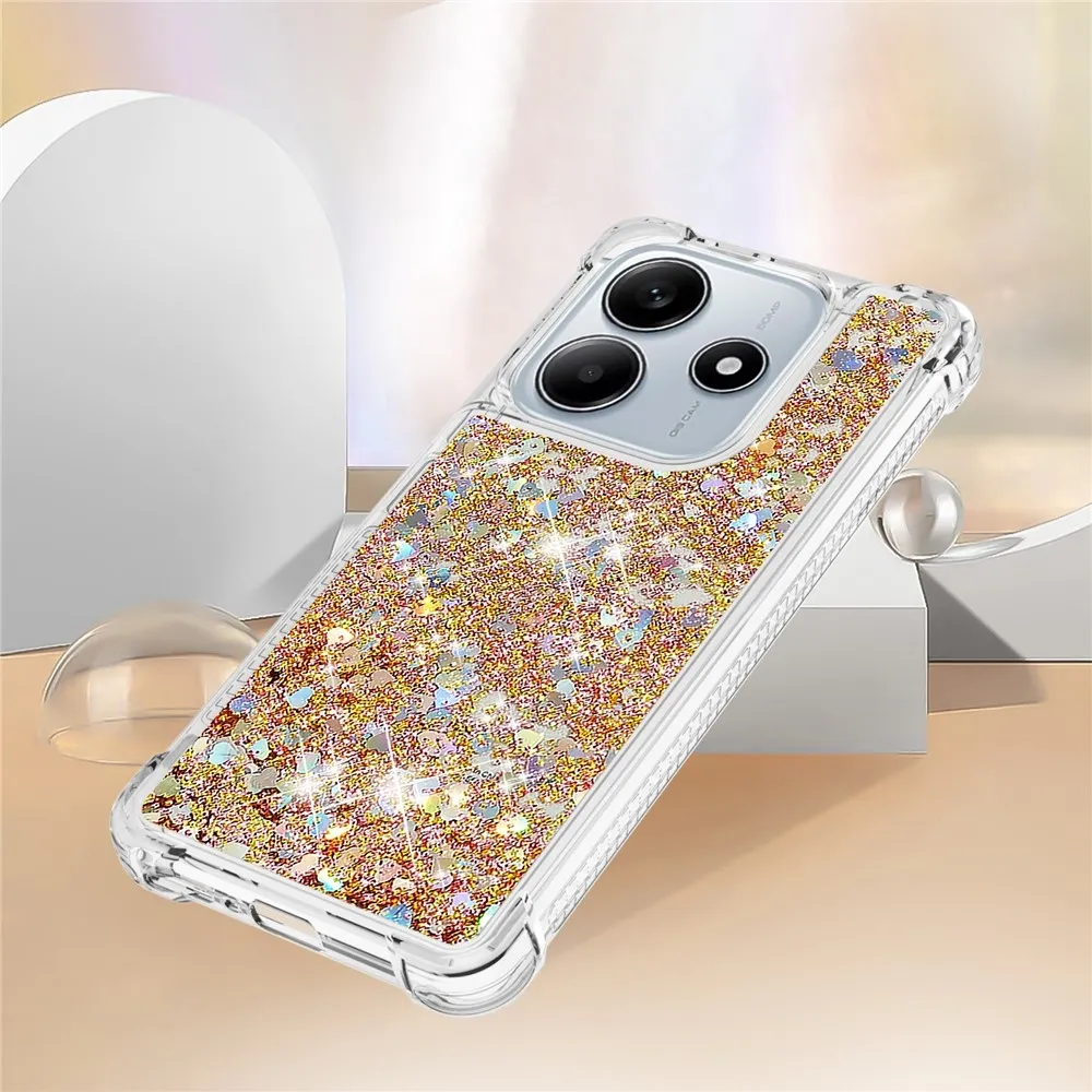 Glitter přesýpací gelový obal na Xiaomi Redmi Note 14 5G - zlatý/srdíčka