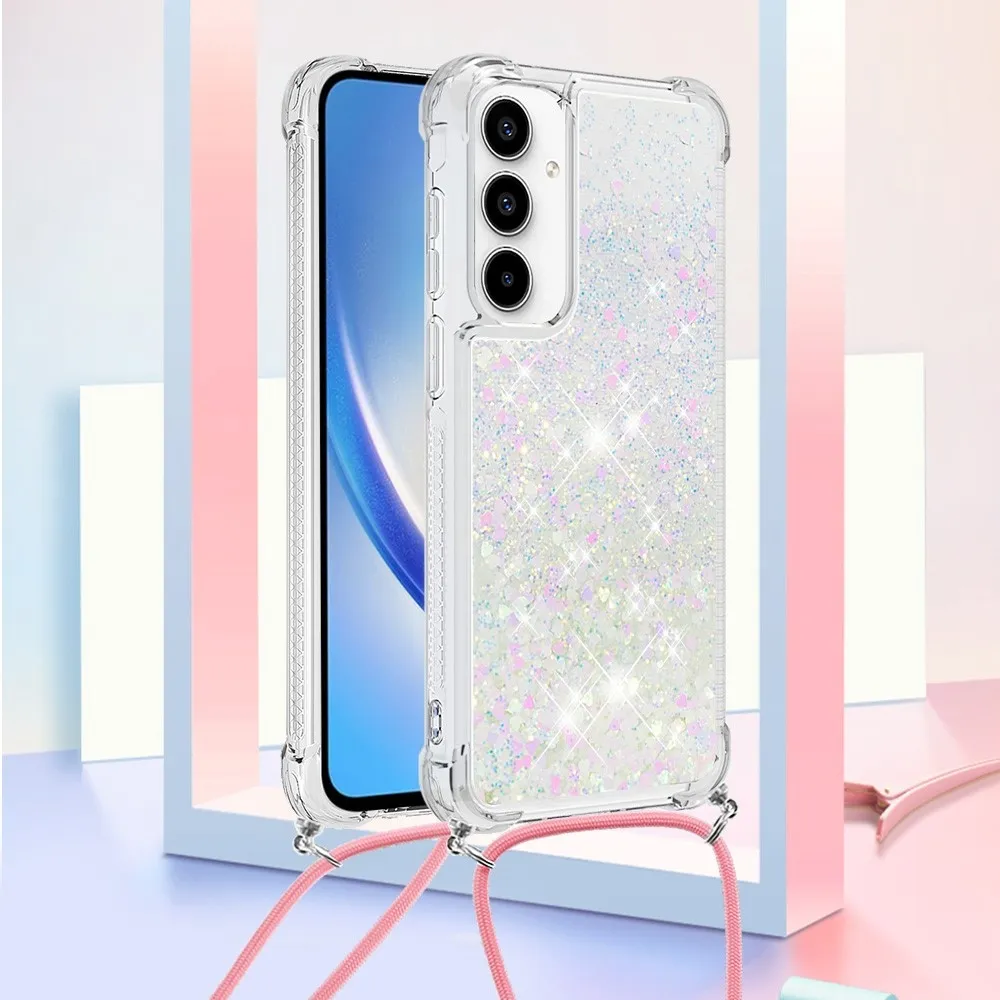 ✅【Vylepšená ochrana proti pádu】 Měkká TPU hrana obklopující pouzdro Glitters se šňůrkou na mobil Samsung Galaxy A56 5G - růžovostříbrné se srdíčky poskytuje vynikající ochranu proti pádu a prevenci pádu a zajišťuje, že váš telefon zůstane v bezpečí před náhodnými nárazy a každodenním opotřebením