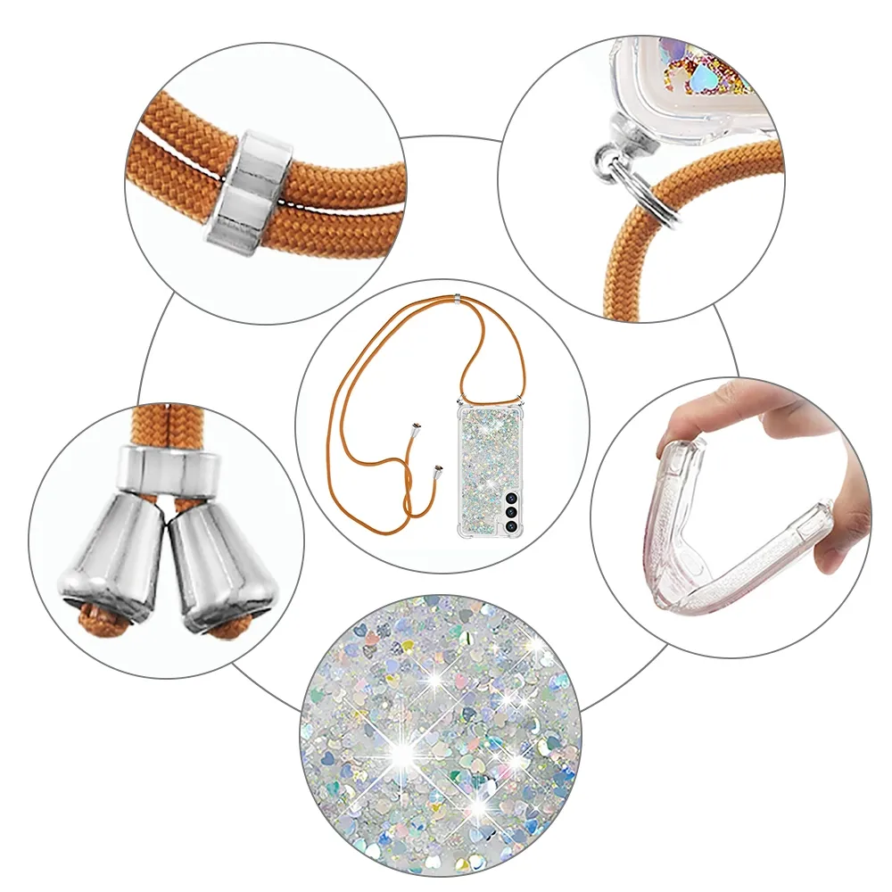 ✅【Vylepšená ochrana proti pádu】 Měkká TPU hrana obklopující pouzdro Glitters se šňůrkou na mobil Samsung Galaxy S26/S26 Pro - stříbrné se srdíčky poskytuje vynikající ochranu proti pádu a prevenci pádu a zajišťuje, že váš telefon zůstane v bezpečí před náhodnými nárazy a každodenním opotřebením