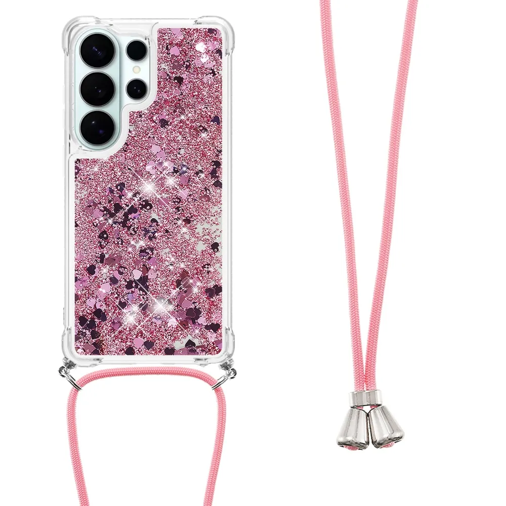 Glitters přesýpací gelový obal se šňůrkou na Samsung Galaxy S26 Ultra - růžovozlatý/srdíčka