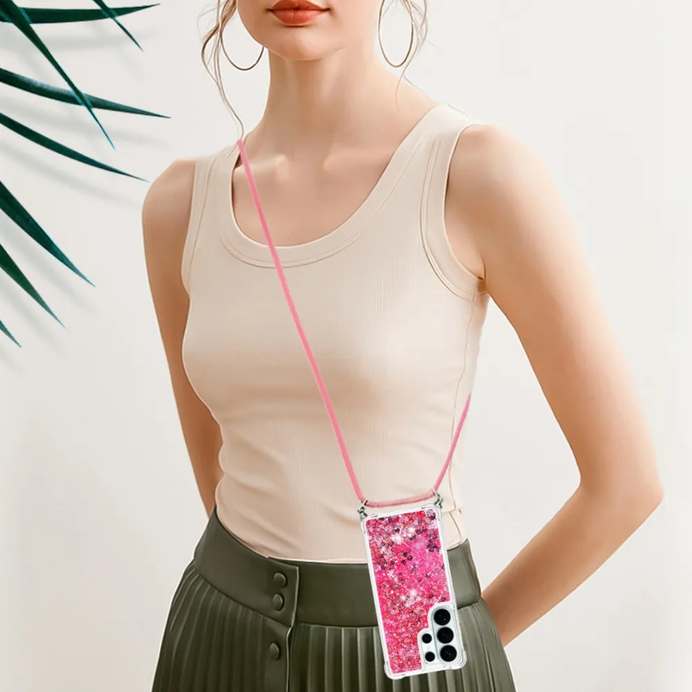 Glitters přesýpací gelový obal se šňůrkou na Samsung Galaxy S26 Ultra - růžový/srdíčka