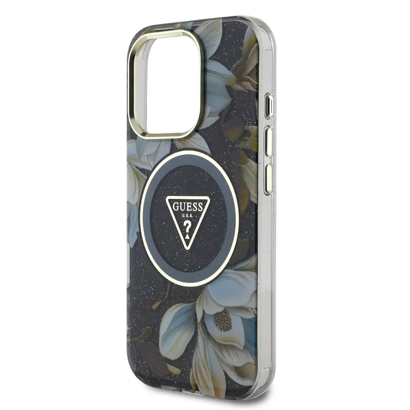 Guess IML Glitter Magnolia and Triangle Logo MagSafe Zadní Kryt pro iPhone 16 Pro Black