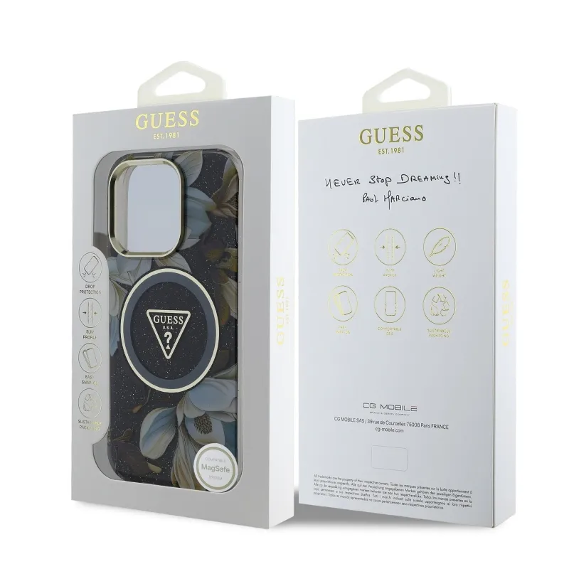 Guess IML Glitter Magnolia and Triangle Logo MagSafe zadní kryt na telefon je skvělým doplňkem pro všechny milovníky stylu a praktičnosti.