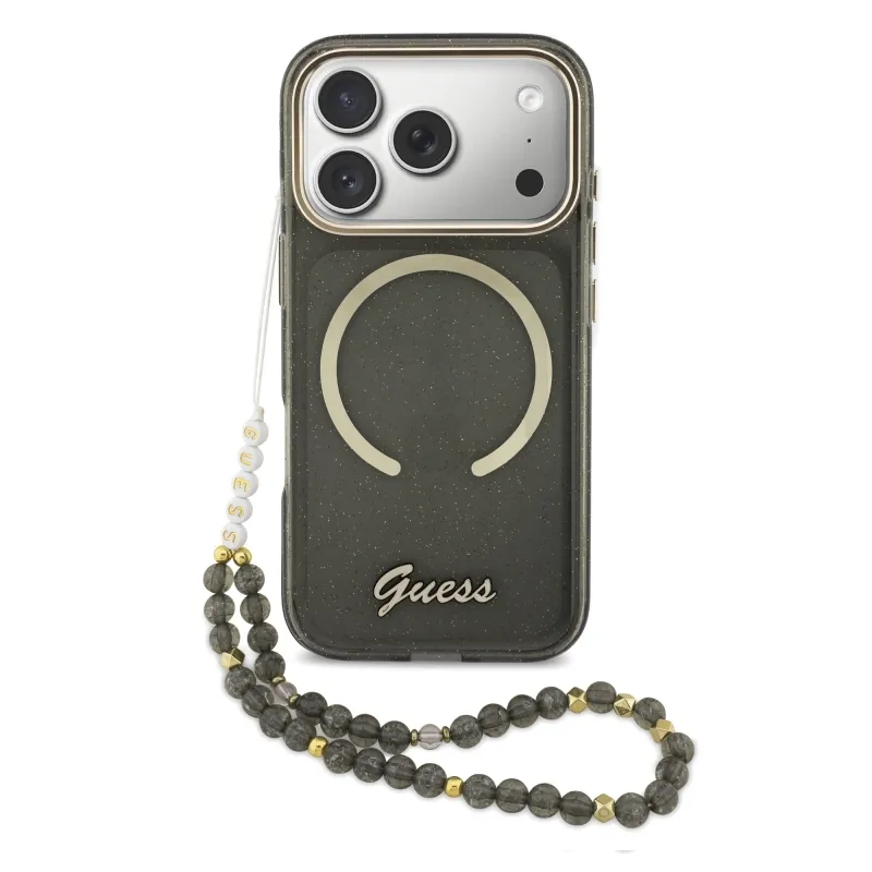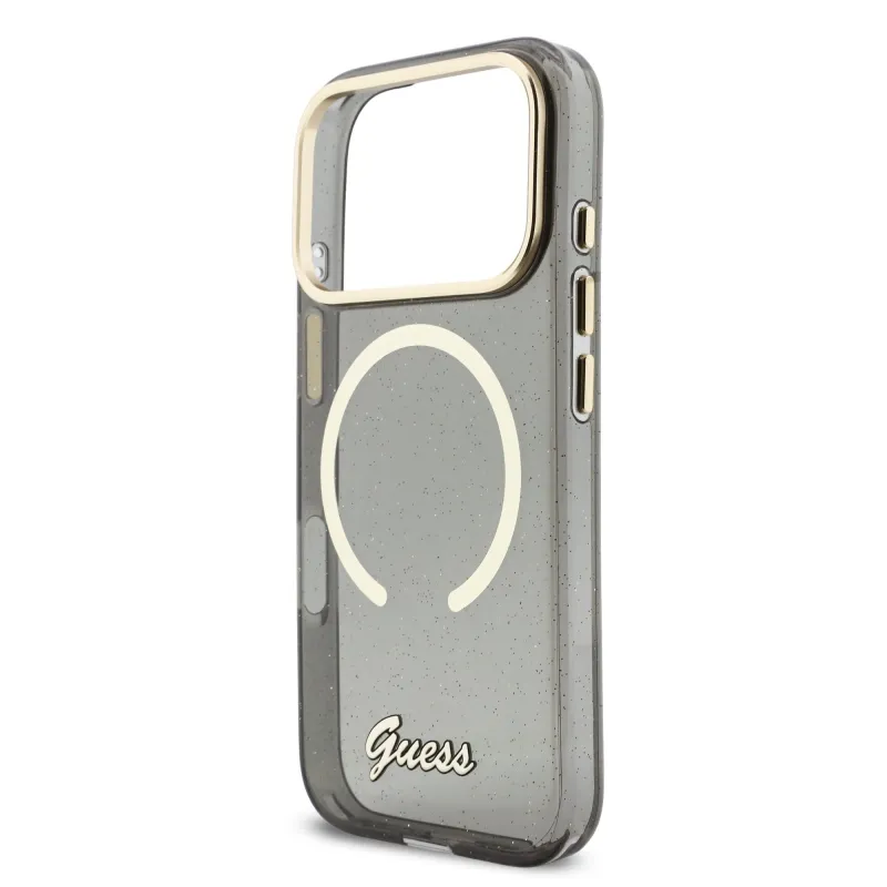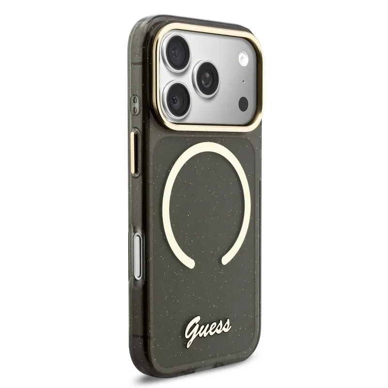 Guess IML Glitter Script Strap MagSafe Zadní Kryt pro iPhone 17 Pro Black