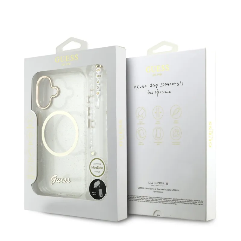 Guess IML Glitter Script Strap MagSafe Zadní Kryt pro iPhone 17 Transparent