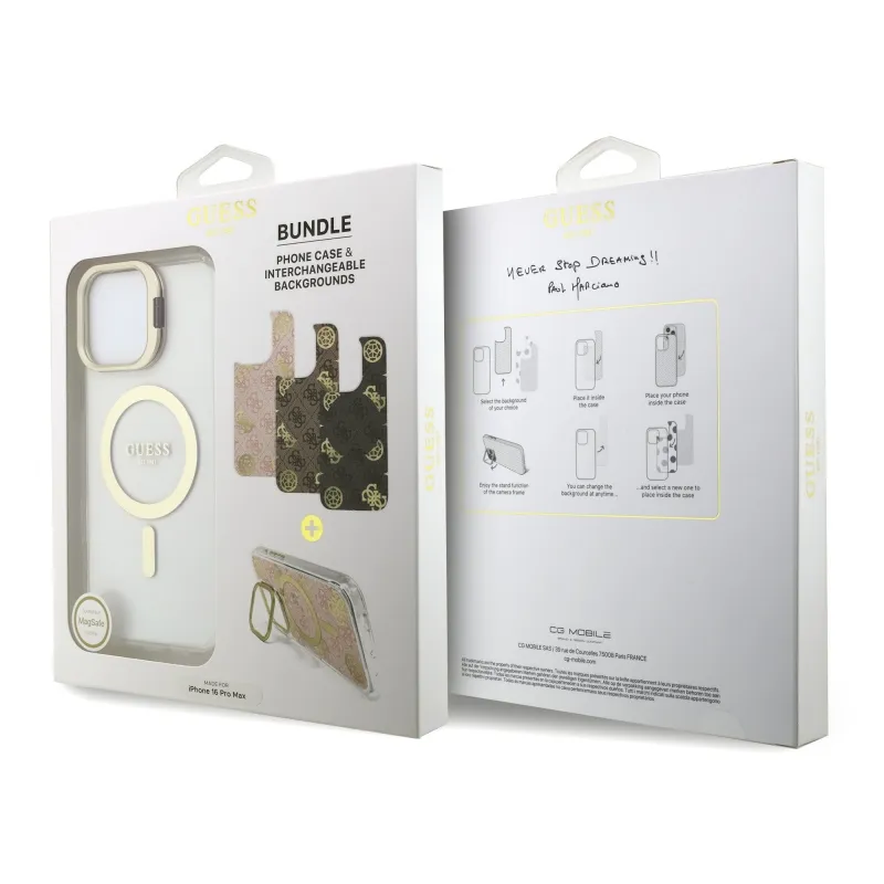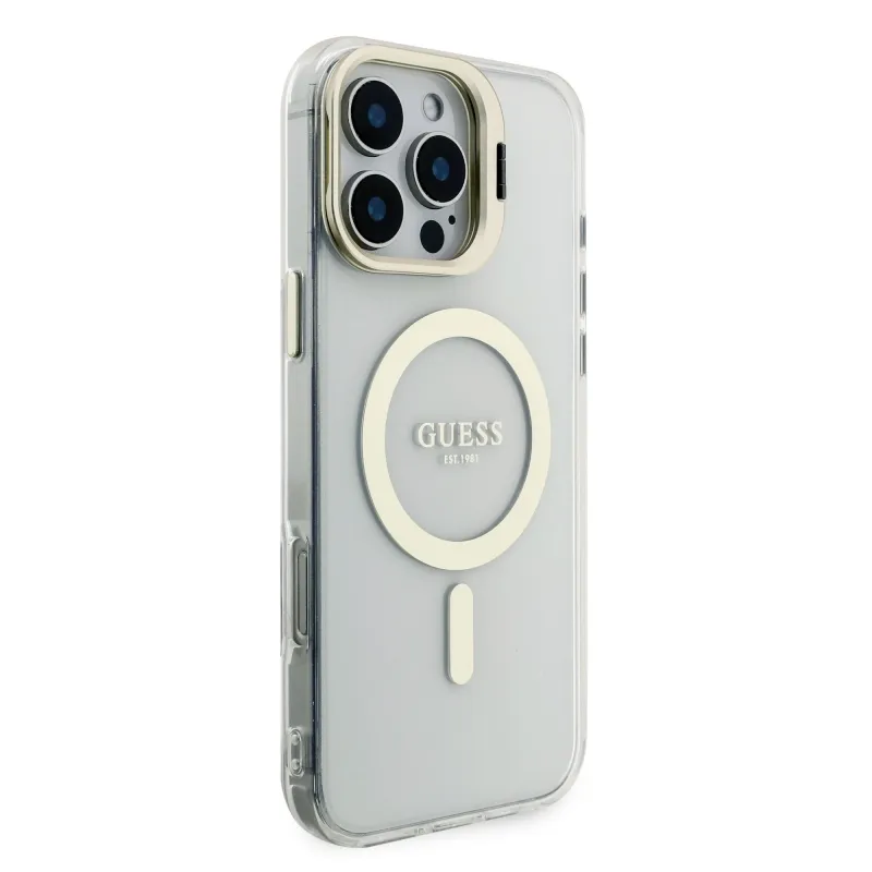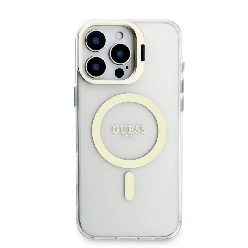 Guess PC/TPU Electroplated Stand Camera Frame MagSafe zadní kryt je dokonalý doplněk pro váš telefon i váš outfit, který kombinuje funkčnost a styl v jednom.