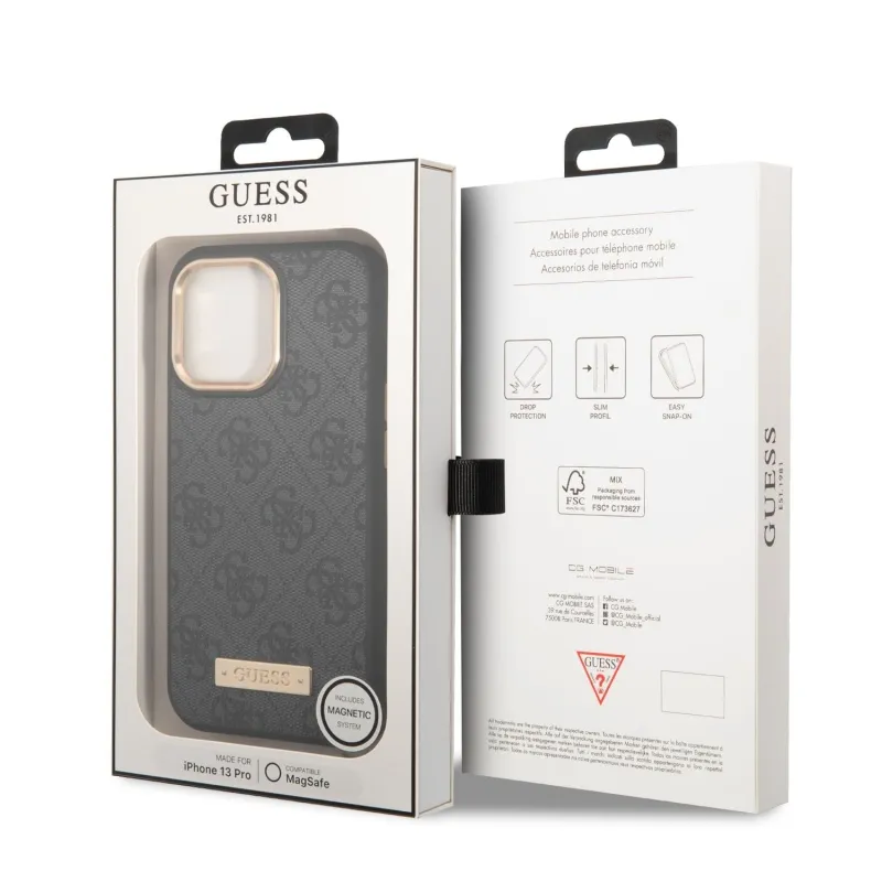Guess 4G Magnetic prémiový ochranný kryt telefonu v kombinaci zadní strany s potažená látkou s motivem Guess, pružnými PU boky a vestavěným magnetem pro Apple MagSafe příslušenství.