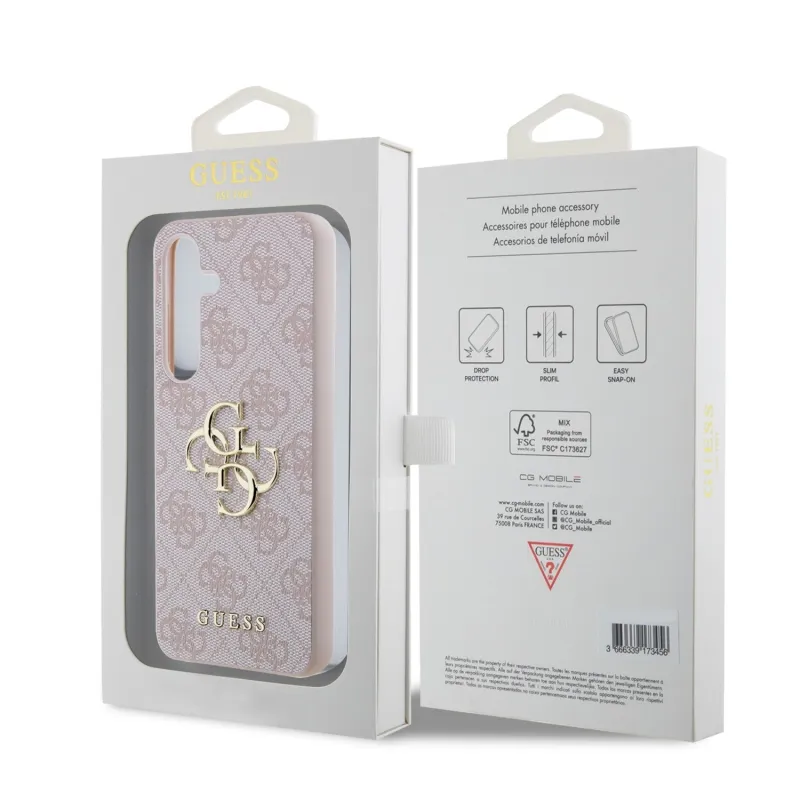 Prémiový zadní kryt Guess PU 4G Metal Logo se vyznačuje elegantním, charakteristickým 4G vzorem, doplněným o logo GUESS.