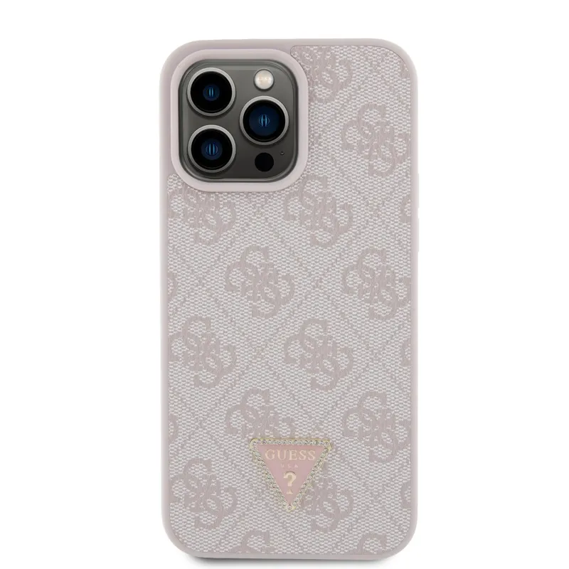 Guess PU 4G Strass Triangle Metal Logo Zadní Kryt pro iPhone 15 Pro Max Pink