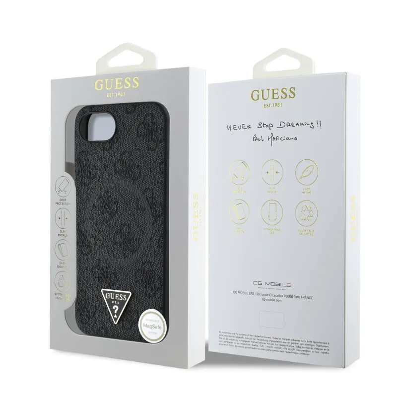Prémiový zadní kryt Guess PU 4G Strass Triangle Metal Logo se vyznačuje elegantním, charakteristickým 4G vzorem, doplněným o zlaté triangle logo GUESS.