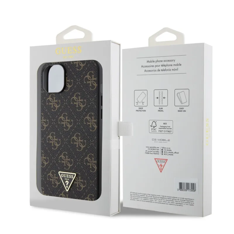 Prémiový zadní kryt Guess PU 4G Triangle Metal Logo se vyznačuje elegantním, charakteristickým 4G vzorem, doplněným o zlaté triangle logo GUESS.