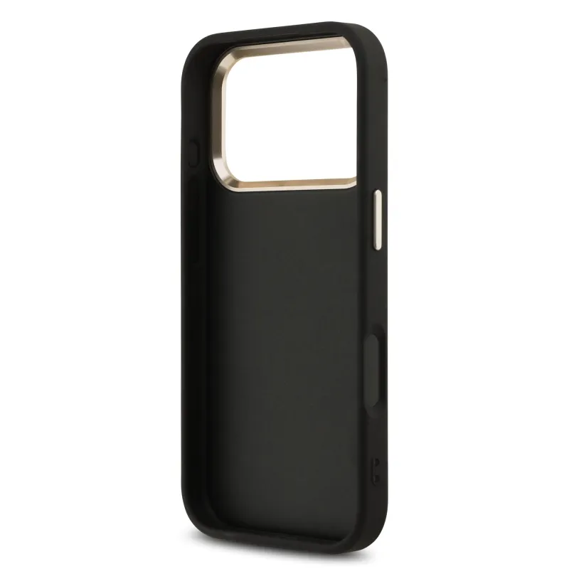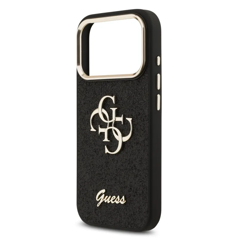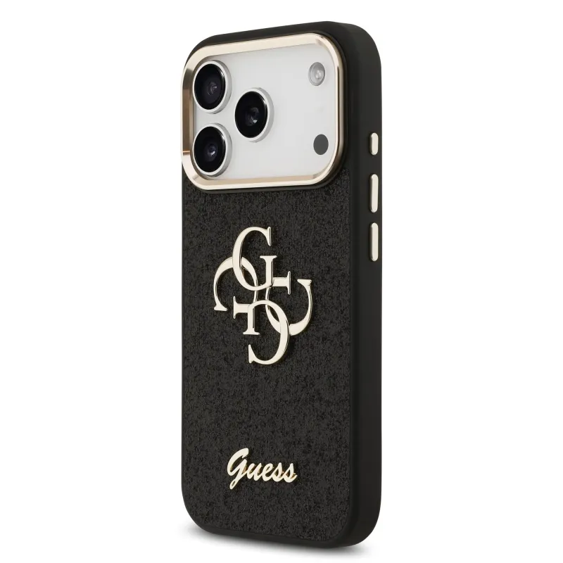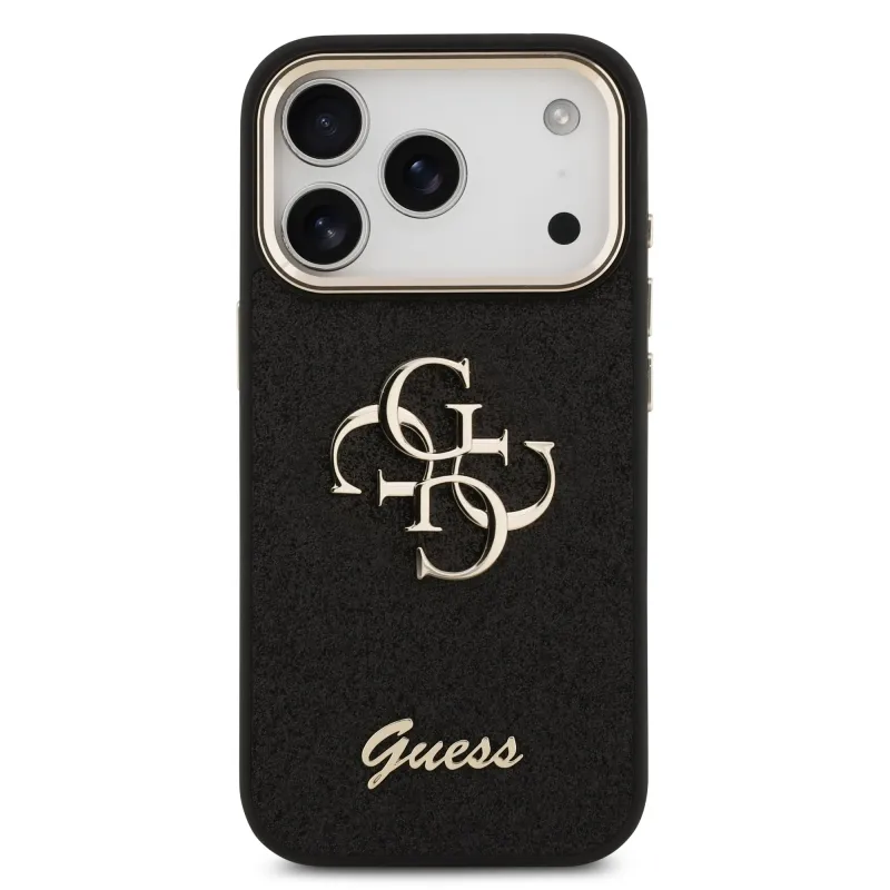 Guess PU Fixed Glitter 4G Metal Frame Zadní Kryt pro iPhone 17 Pro Black