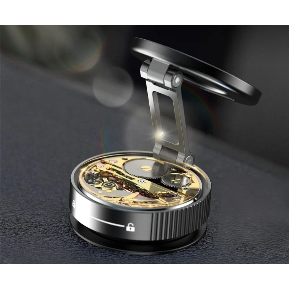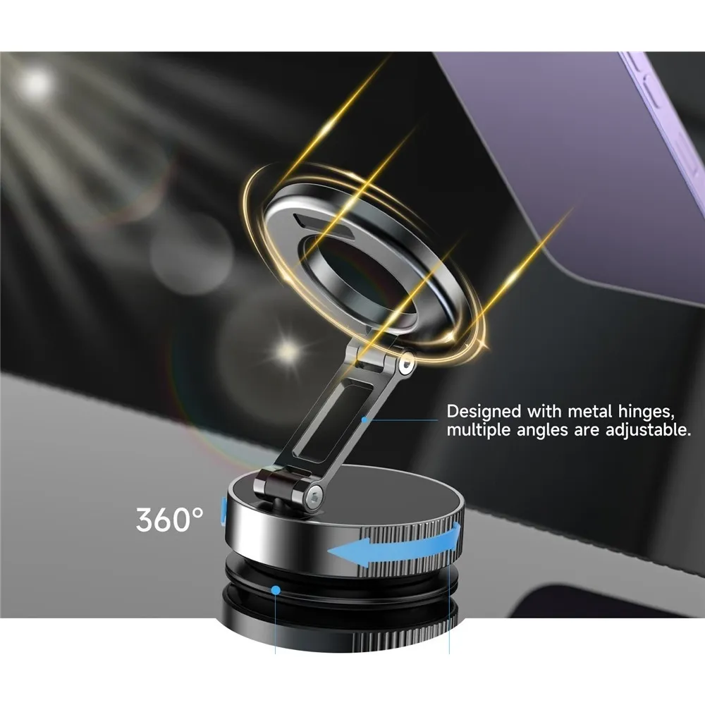 Univerzální stříbrný skládací držák na mobil s magnetickým uchycením a silnou vakuovou přísavkou pro použití na stole i v autě.