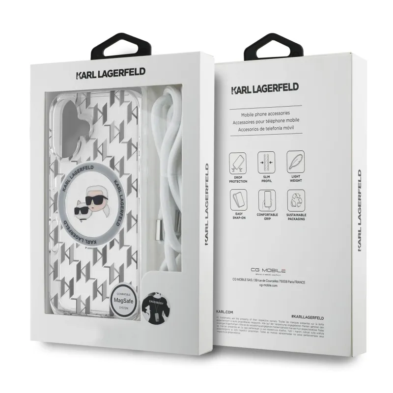 S prémiovým krytem Karl Lagerfeld IML Monogram Crossbody K&CH Heads MagSafe získáte nejen elegantní ochranu pro váš telefon, ale také praktický crossbody popruh.