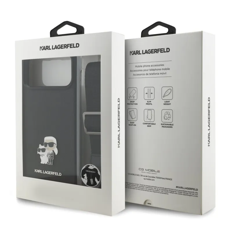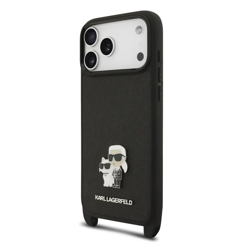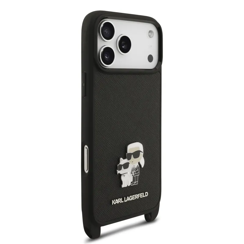 Karl Lagerfeld Saffiano Crossbody Popruh Metal Karl and Choupette Zadní Kryt pro iPhone 17 Pro Black
