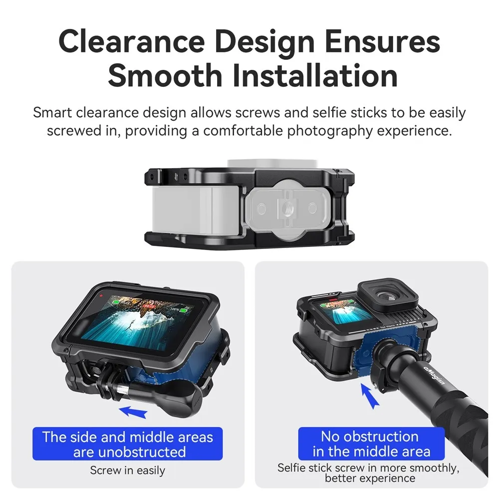 Instalace je jednoduchá, kamera se vloží do rámu a zajistí pomocí přiloženého příslušenství. Konstrukce je vhodná pro použití se stativy, držáky na kolo, helmovými držáky i dalším sportovním vybavením.