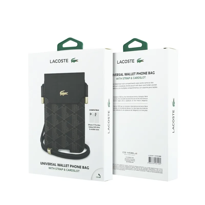 Lacoste PVC Blend Monogram Metal Logo Kapsa na Telefon XL je dostatečně prostorná, aby pojala telefon o velikosti až iPhone 17 Pro Max nebo Galaxy S25 Ultra, stejně jako jiné menší modely telefonů.