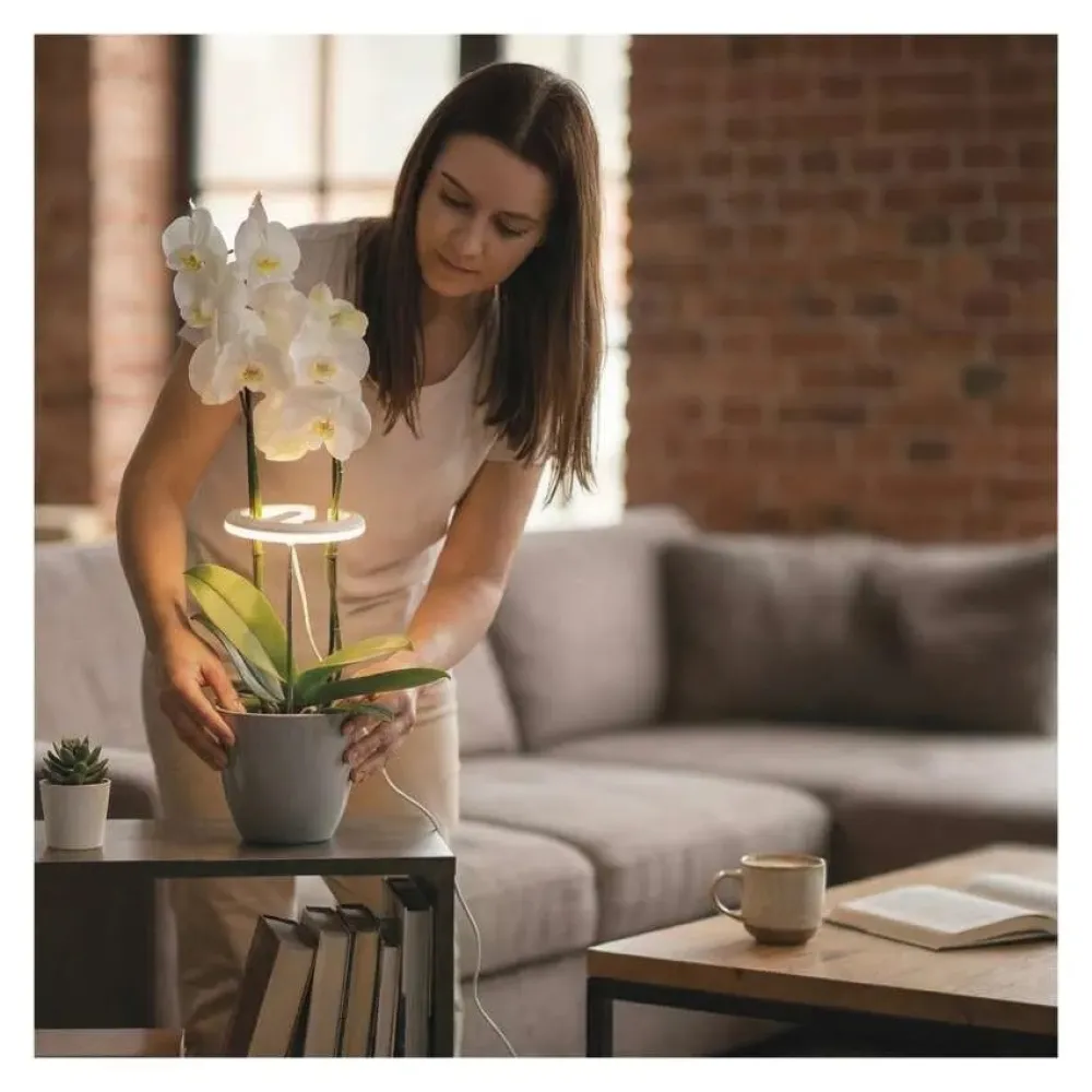 Kruhové svítidlo je navrženo tak, aby se dalo umístit i pod květy rostliny a osvětlovalo je jemně zespodu směrem k listům a stonkům. Díky tomu poskytuje rostlinám dostatek světla pro růst, aniž by docházelo k přímému přehřívání nebo poškození citlivého květenství. Je tak ideálním řešením pro orchideje a všechny rostliny s citlivým květenstvím.