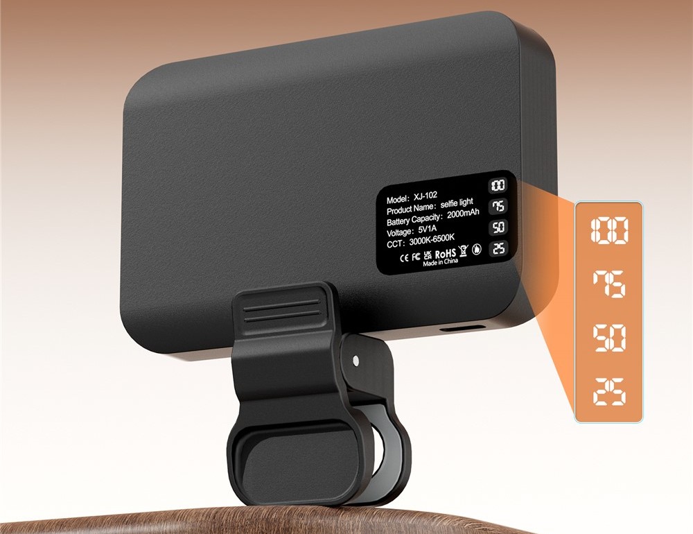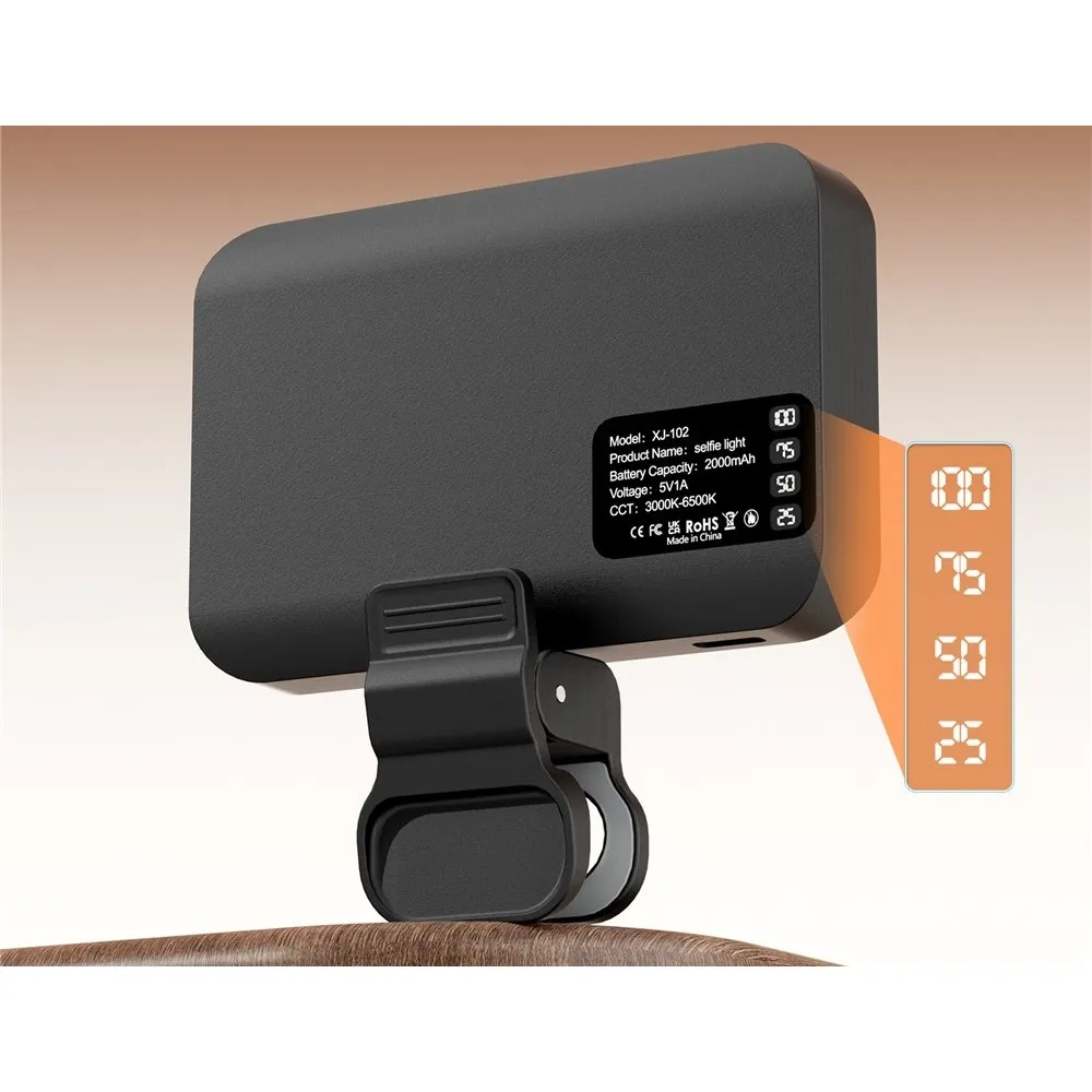 XJ102 přenosné LED přisvětlení s klipem 3 teploty světla je praktické světlo pro natáčení videí, livestream, focení i videohovory. Díky kompaktním rozměrům a klipu jej snadno připevníte na telefon, notebook nebo stativ a získáte lepší osvětlení v každé situaci.