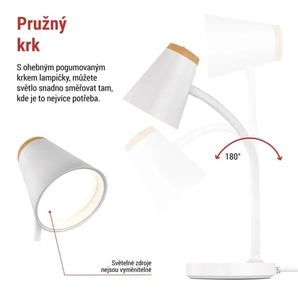 Díky ohybnému krku můžete světlo nasměrovat přesně tam, kde ho potřebujete. Lampa se tak dokonale přizpůsobí vaším aktuálním potřebám - ať už čtete, pracujete na počítači nebo studujete. Kompaktní rozměry navíc šetří místo, zatímco stabilní základna zaručuje bezpečné používání.