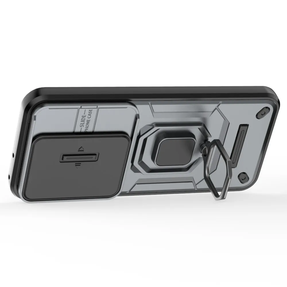 Naše odolné pouzdro kombinuje v sobě pevnost kovu, flexibilitu pružného gelu a praktičnost plastu, aby vašemu telefonu poskytlo maximální ochranu před pády, škrábanci a dalším poškozením. Šedá barva dodává elegantní a moderní vzhled, zatímco inovativní obal s posuvným krytem čočky fotoaparátu zajišťuje, že vaše fotky budou vždy ostré a bez poškrábání čočky.