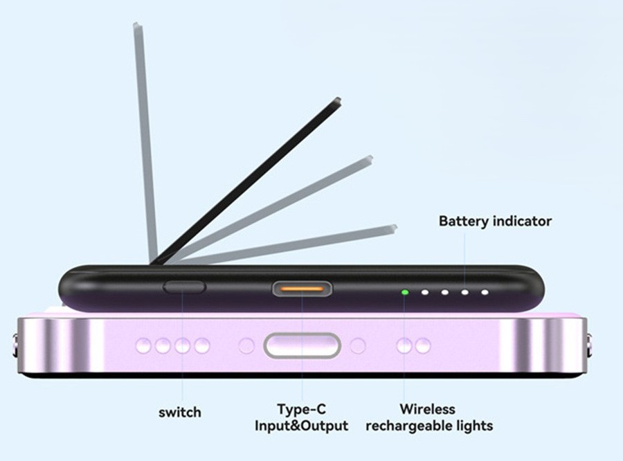 Powerbanka podporuje bezdrátové nabíjení až 15 W a zároveň nabízí rychlé kabelové nabíjení přes USB-C port. Díky tomu lze efektivně nabíjet různé typy zařízení podle potřeby. Kapacita 5000 mAh je ideální pro rychlé doplnění energie během dne.