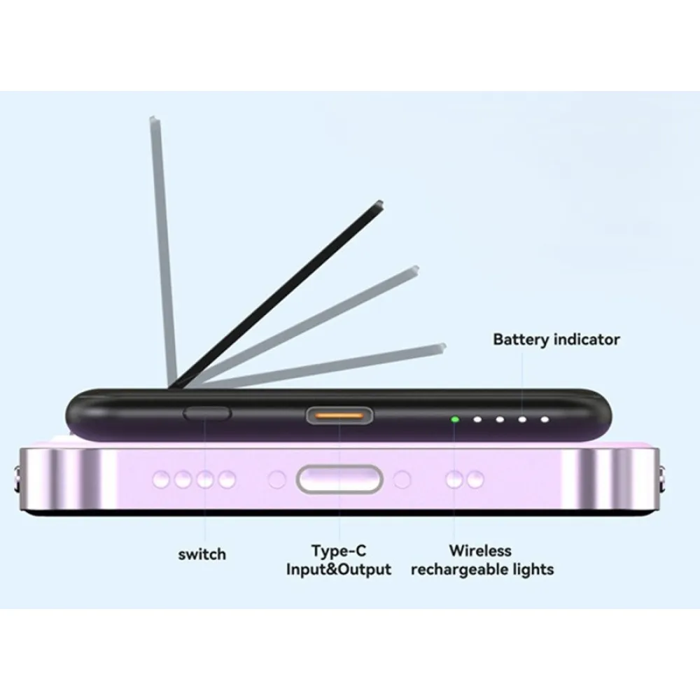 M10 ultra tenká magnetická powerbanka 5000 mAh s bezdrátovým nabíjením 15W a stojánkem je elegantní a praktický doplněk pro každodenní nabíjení. Díky magnetickému uchycení se snadno připojí k telefonu a umožňuje pohodlné bezdrátové nabíjení bez kabelů.