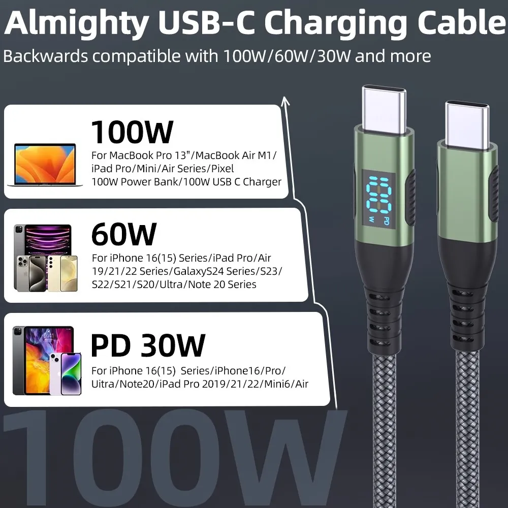 USB-C / USB-C kabel s displejem je navržen pro rychlé nabíjení i spolehlivý přenos dat u moderních zařízení. Podporuje výkon až 100 W (5A/20V), takže bez problémů zvládne napájet nejen telefony a tablety, ale i notebooky.