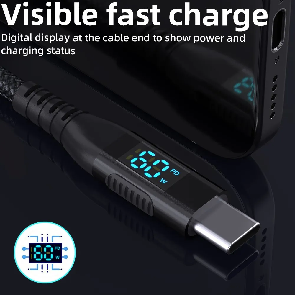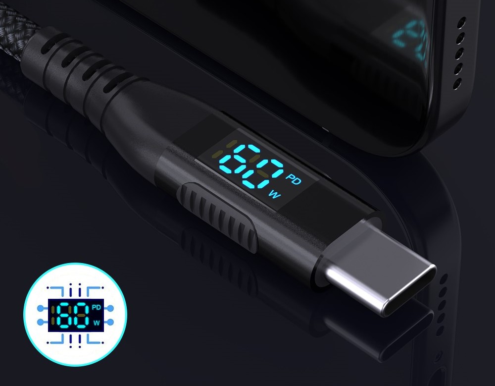 Integrovaný digitální displej zobrazuje aktuální výkon nabíjení v reálném čase, což poskytuje přehled o průběhu nabíjení. Kabel podporuje technologie PD, QC, AFC a FCP, díky čemuž zajišťuje rychlé a efektivní nabíjení.