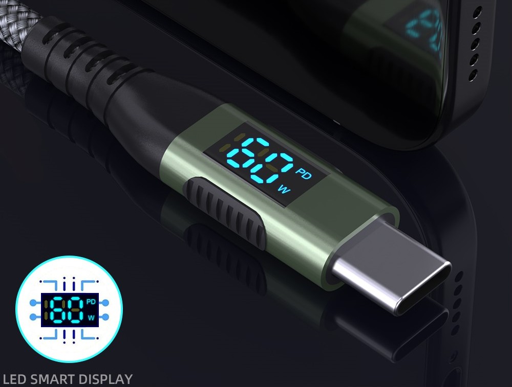 Integrovaný digitální displej zobrazuje aktuální výkon nabíjení v reálném čase, což poskytuje přehled o průběhu nabíjení. Kabel podporuje technologie PD, QC, AFC a FCP, díky čemuž zajišťuje rychlé a efektivní nabíjení.