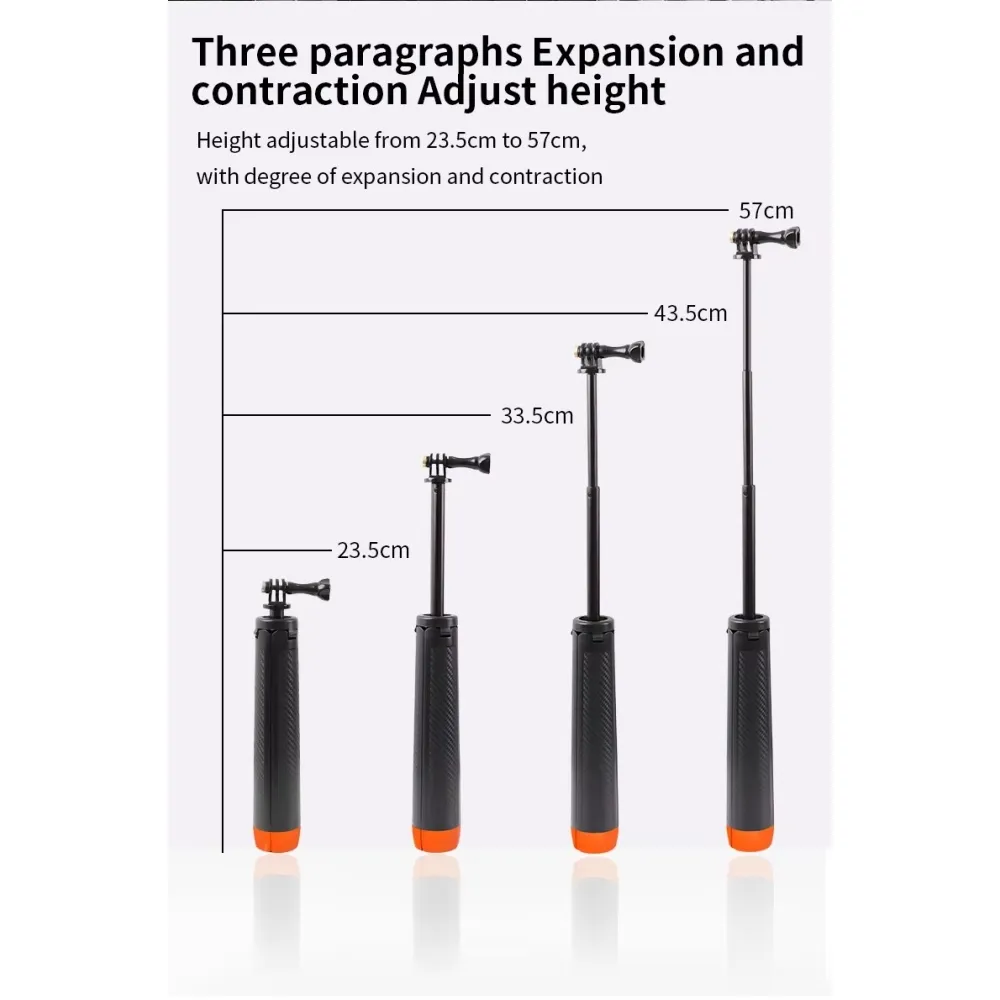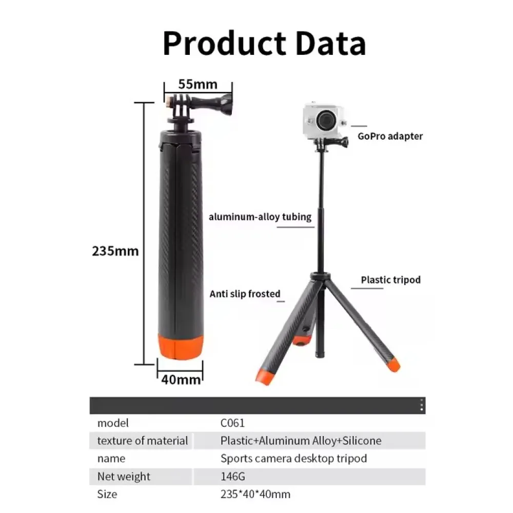 Model: C063 Typ příslušenství: plovoucí selfie tyč a stabilizátor Hmotnost: 149 g Rozměry ve složeném stavu: 235 × 40 mm Rozsah výšky: 32,5 – 57 cm Vlastnosti: plovoucí provedení, stabilizace obrazu, voděodolné použití Závit: standardní 1/4" Určení: akční kamery GoPro a další kompatibilní modely Barva: oranžová / černá kombinace