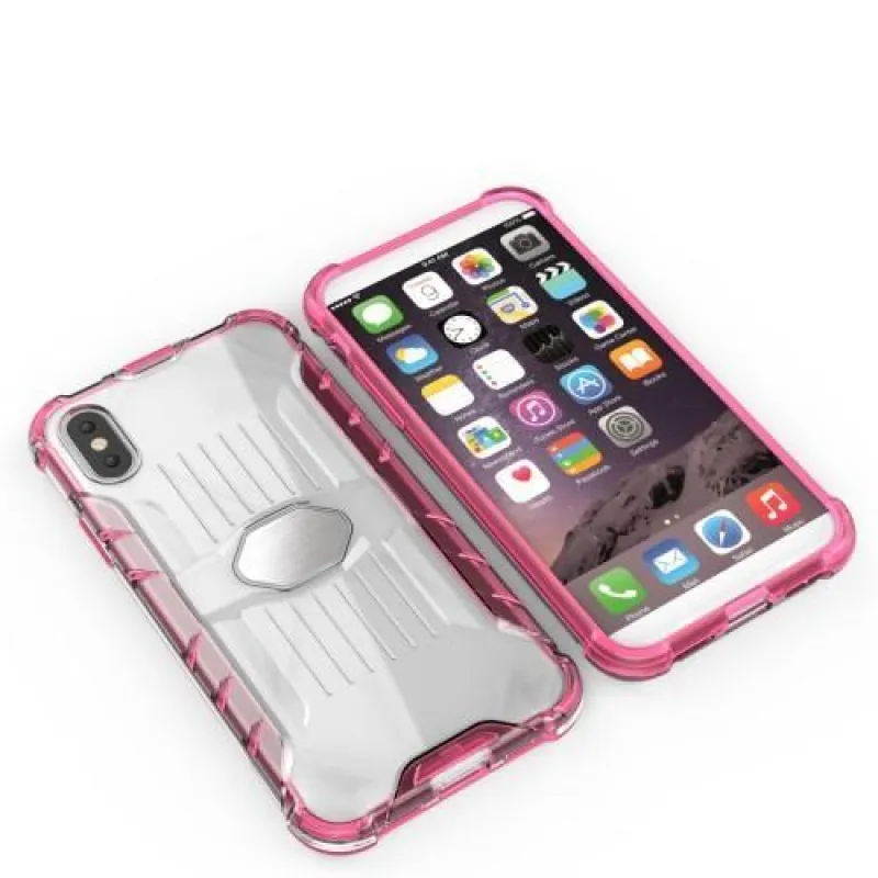 Jak už název sám o sobě vypovídá, jedná se o obal kombinující dvě různé funkční vlastnosti. Tento netradiční kousek vyrobený pro iPhone X z pružného silikonu a pevného plastu plní především ochranou funkci. Při pádu zmírní možné následky vyztužené rohy. Nezaostává ani z hlediska designu. Kryt připomíná nedobytný opancéřovaný trezor v kombinaci průhledné s rose barvě. Má spoustu výřezů po stranách a linií čar na středu. Na displej doporučujeme pořídit tvrzené sklo.