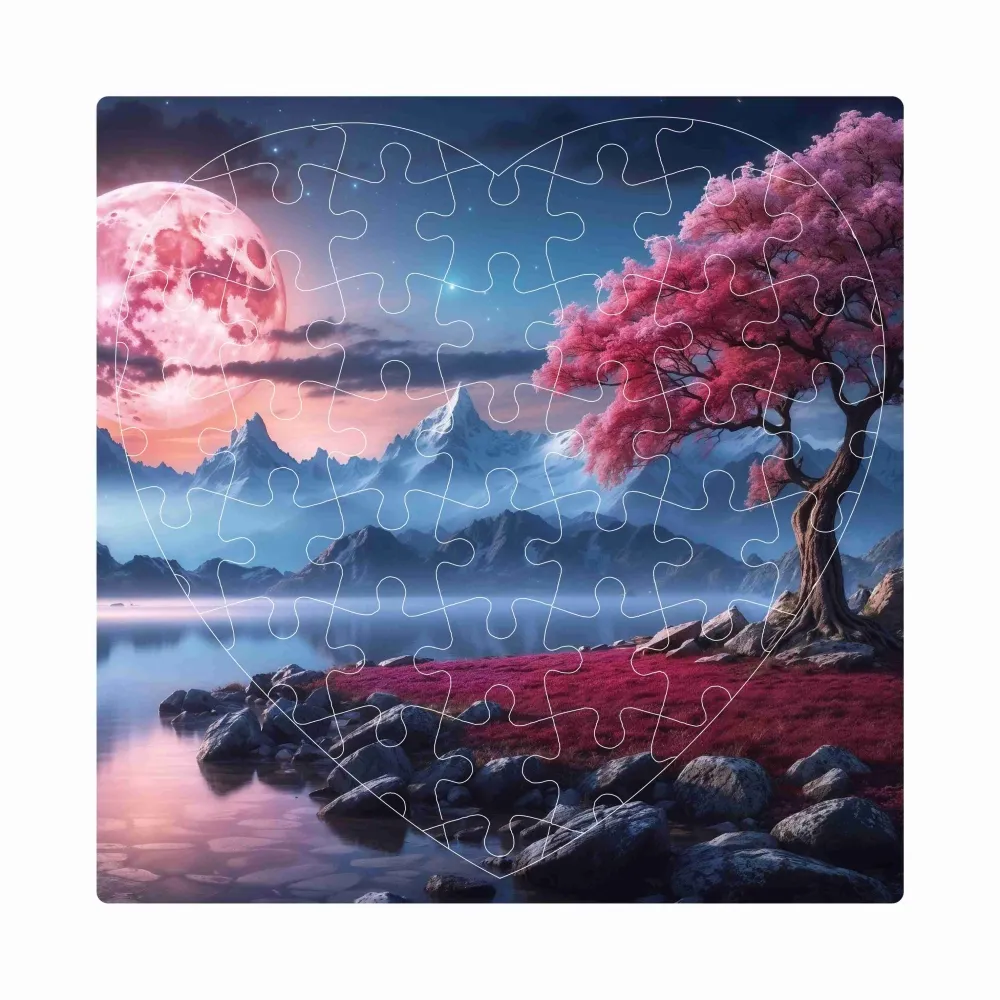 Kvalitní puzzle 19x18cm ve tvaru srdce (76 dílků) a obrázek fantasy krajina
