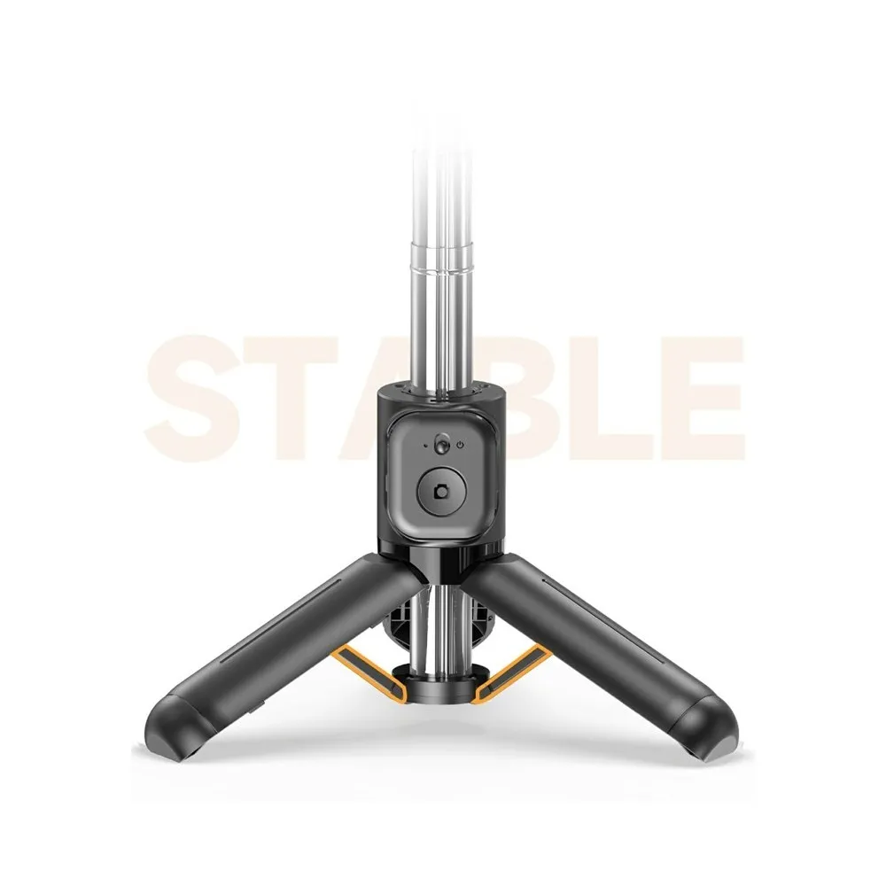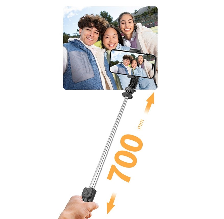 Teleskopická tyč umožňuje roztažení až do výšky 700 mm, což poskytuje dostatek prostoru pro skupinové fotografie i širší záběry. Stabilní trojnožka zajišťuje pevné postavení na stole nebo jiné rovné ploše. Součástí je také odnímatelný Bluetooth ovladač, který umožňuje pohodlné ovládání fotoaparátu na dálku až do vzdálenosti 10 metrů.