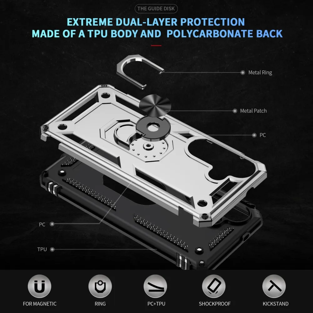 Ring odolný hybridní kryt přináší bezpečí vašemu telefonu po celém obvodu a zezadu, pohyblivá krytka čočky a mírně zvýšené okraje zajišťují dokonalou ochranu citlivých částí. Kovová část umožňuje použití magnetických držáků do auta.