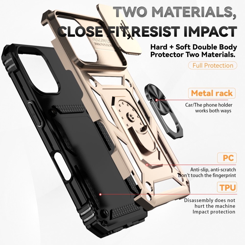 Slide odolný hybridní kryt přináší bezpečí vašemu telefonu po celém obvodu a zezadu, pohyblivá krytka čočky a mírně zvýšené okraje zajišťují dokonalou ochranu citlivých částí. Kovová část umožňuje použití magnetických držáků do auta.