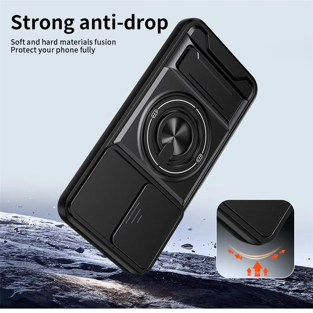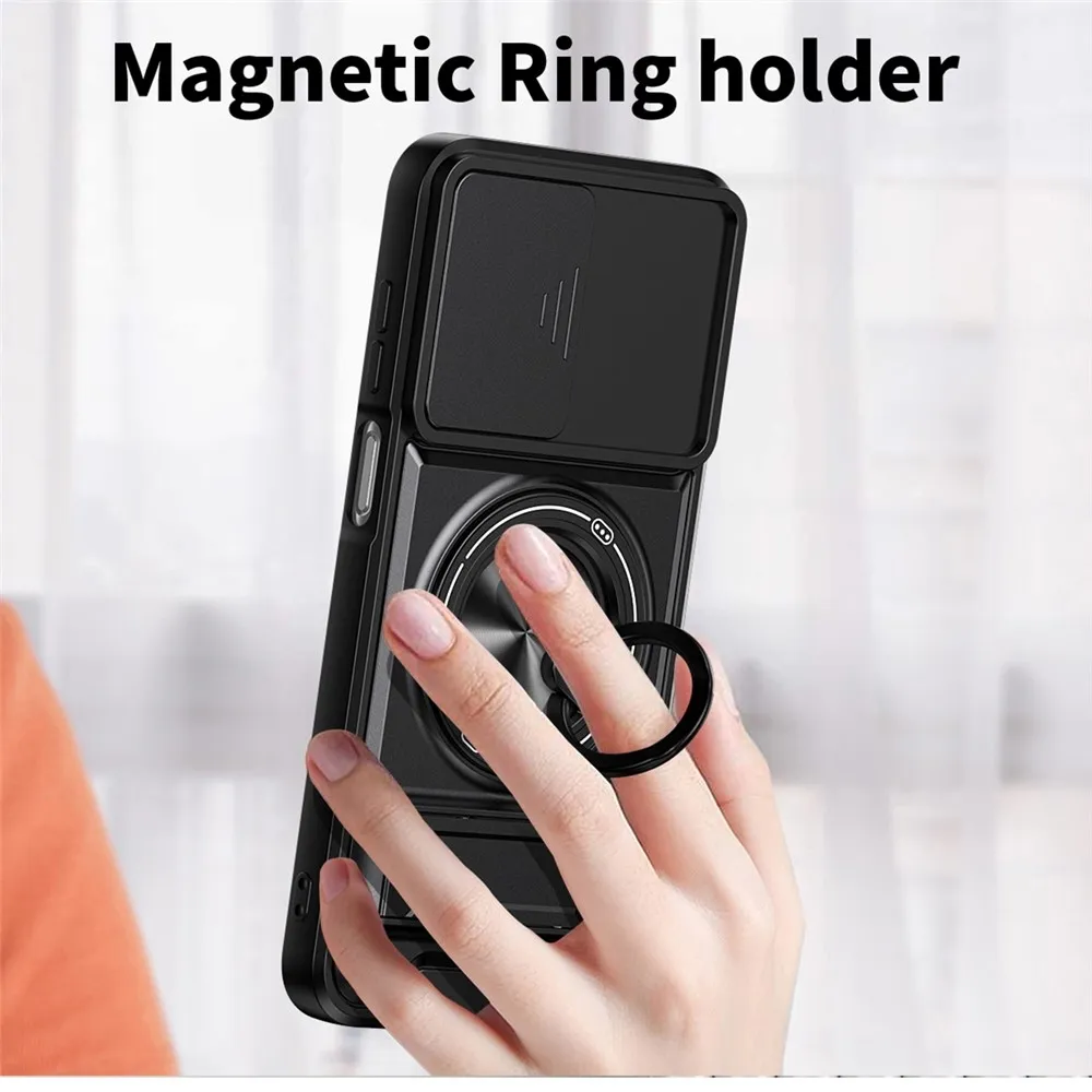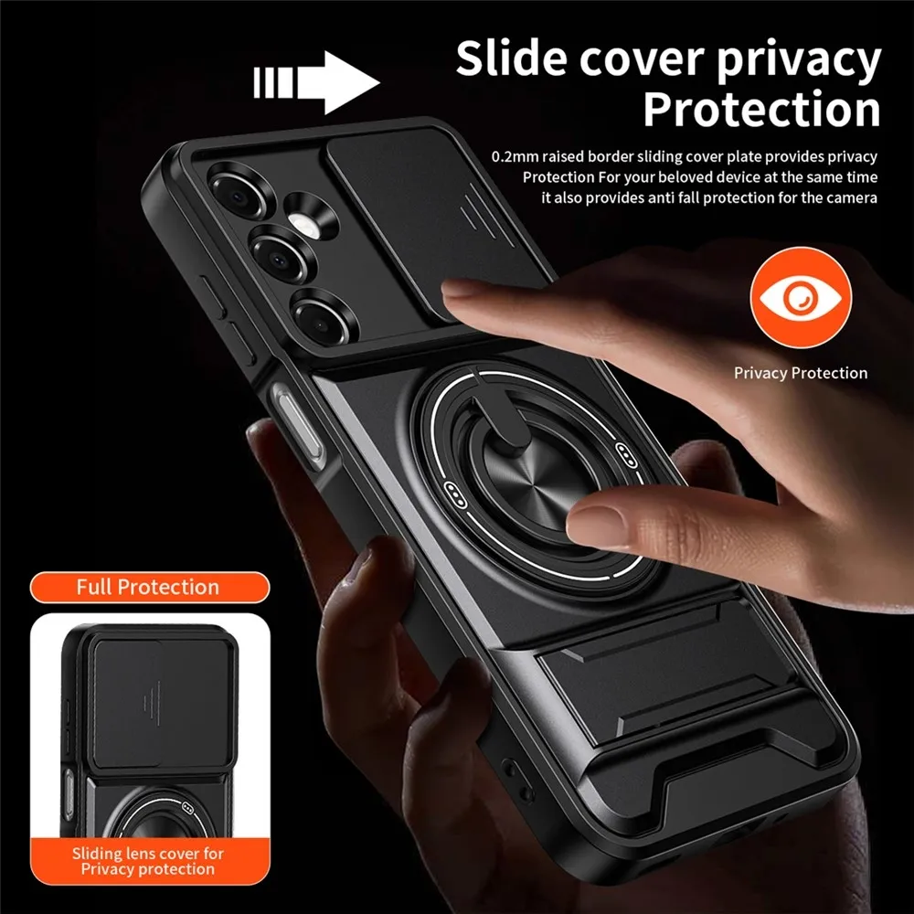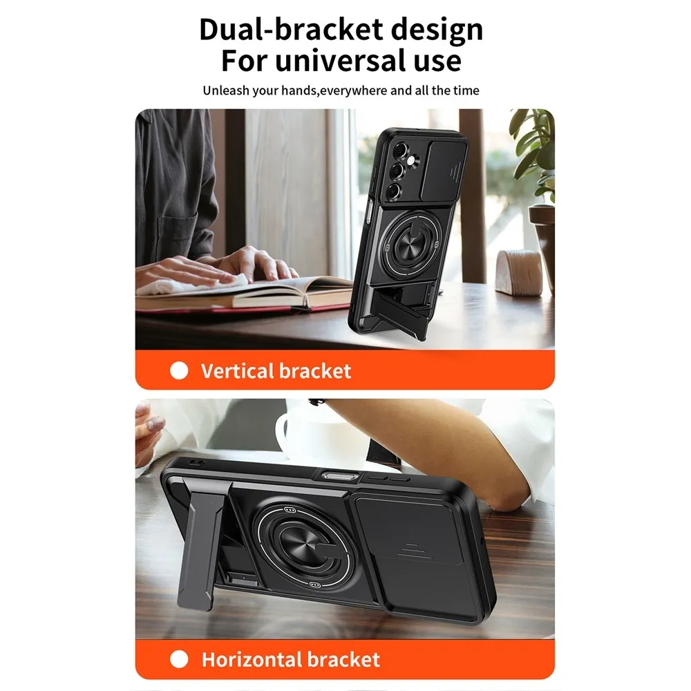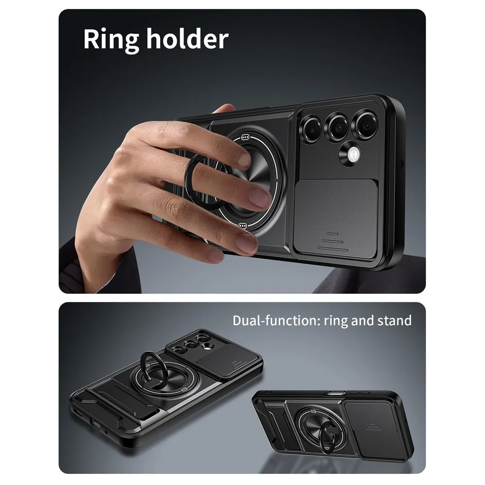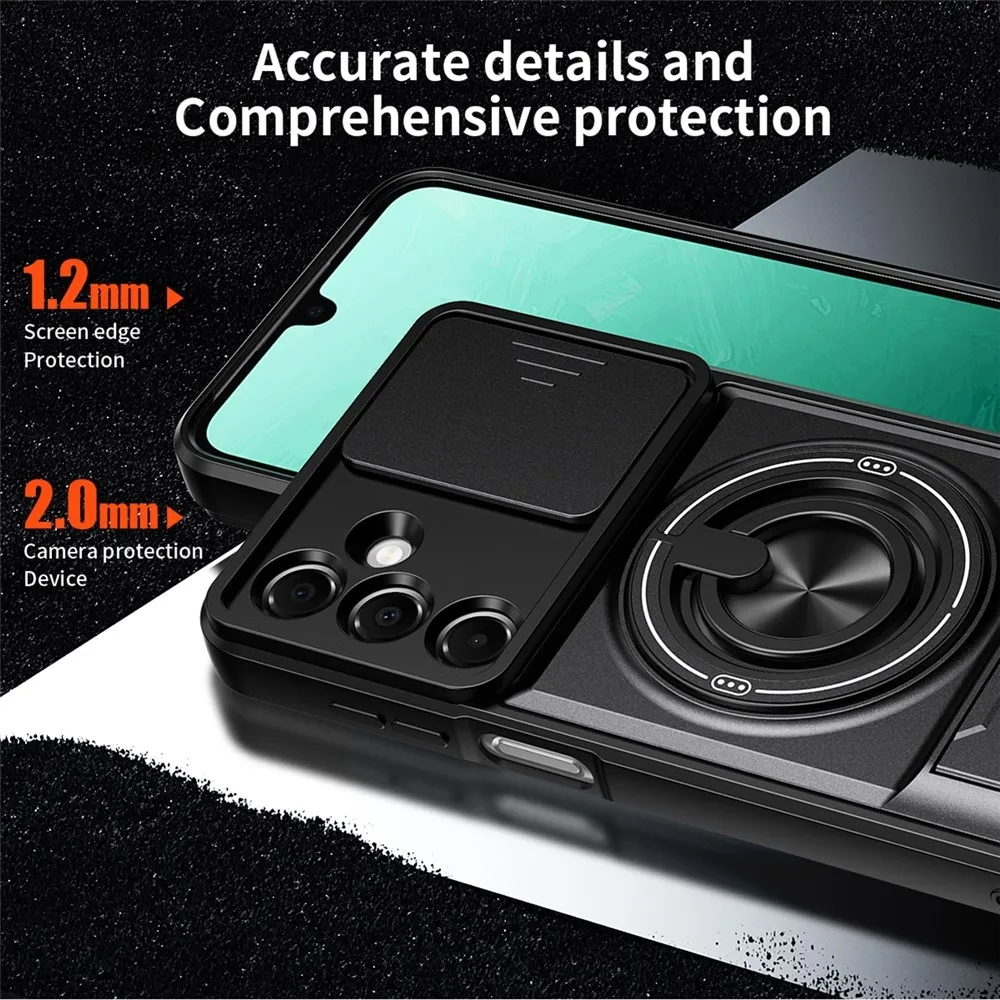 Robustní konstrukce s výraznými liniemi dodává tomuto pouzdru technický a odolný vzhled, který přesně sedí na tvar telefonu Samsung Galaxy A37 5G. Zadní část v černé barvě je doplněna integrovaným otočným kroužkem a výklopným stojánkem pro pohodlné držení i sledování obsahu. Pevný obal chrání záda, hrany i modul fotoaparátu při každodenním používání i náročnějších situacích. Tento kryt patří mezi pouzdra, která spojují vysokou ochranu, funkčnost a výrazný design vytvořený přímo pro konkrétní model telefonu. ✅【Dvouvrstvá ochrana】Kombinuje měkké materiály TPU a tvrdé PC pro zvýšenou odolnost, odolnost proti poškrábání, pádu a otiskům prstů. ✅【Magnetická kompatibilita】Vestavěný silný magnetický kroužek kompatibilní s magnetickými držáky do auta a dalším magnetickým příslušenstvím pro pohodlné uchycení. ✅【Držák na kroužek a skládací stojánek】Vybaveno integrovaným 360° otočným držákem na kroužek pro snadné ovládání jednou rukou. Vestavěný skládací stojánek umožňuje snadné přepínání mezi horizontálním a vertikálním režimem, ideální pro použití bez použití rukou. ✅【Přesné výřezy a zvýšená ochrana】Přesné výřezy umožňují snadný přístup ke všem funkcím, portům a tlačítkům. Zvýšený okraj obrazovky a fotoaparátu lépe chrání váš telefon před náhodným poškozením. ✅【Posuvný kryt objektivu】Navržen s posuvným krytem objektivu, který poskytuje zvýšenou ochranu objektivů fotoaparátu a zabraňuje poškrábání a poškození.