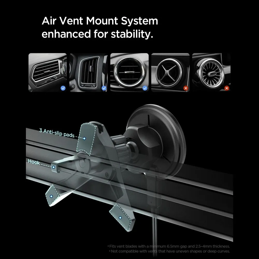 Moderní magnetický držák do auta s nabíjením Spigen EV15MAQ kombinuje pevné uchycení telefonu s funkcí bezdrátového nabíjení MagSafe a Qi2. Díky tomu stačí telefon přiložit a okamžitě začne nabíjení bez nutnosti zapojování kabelu.