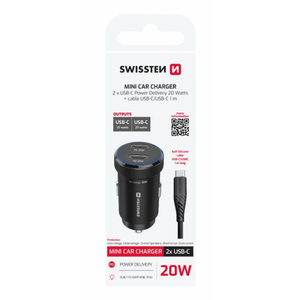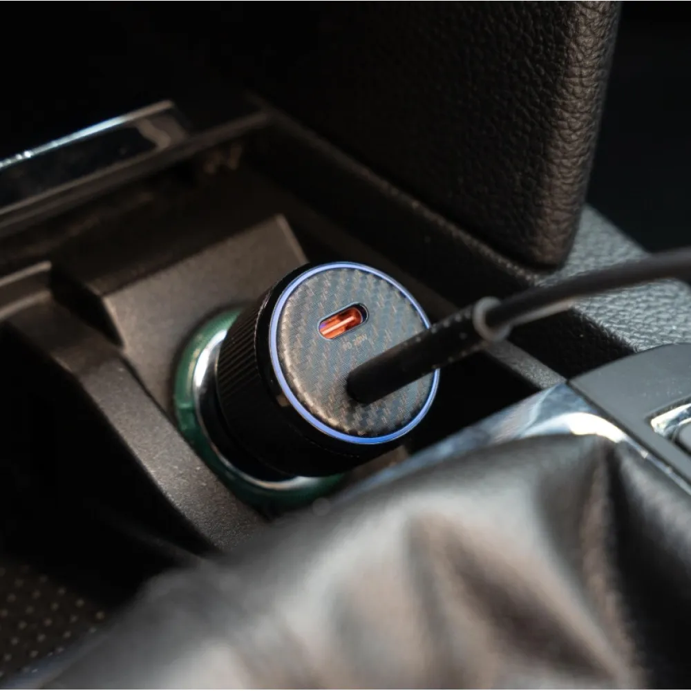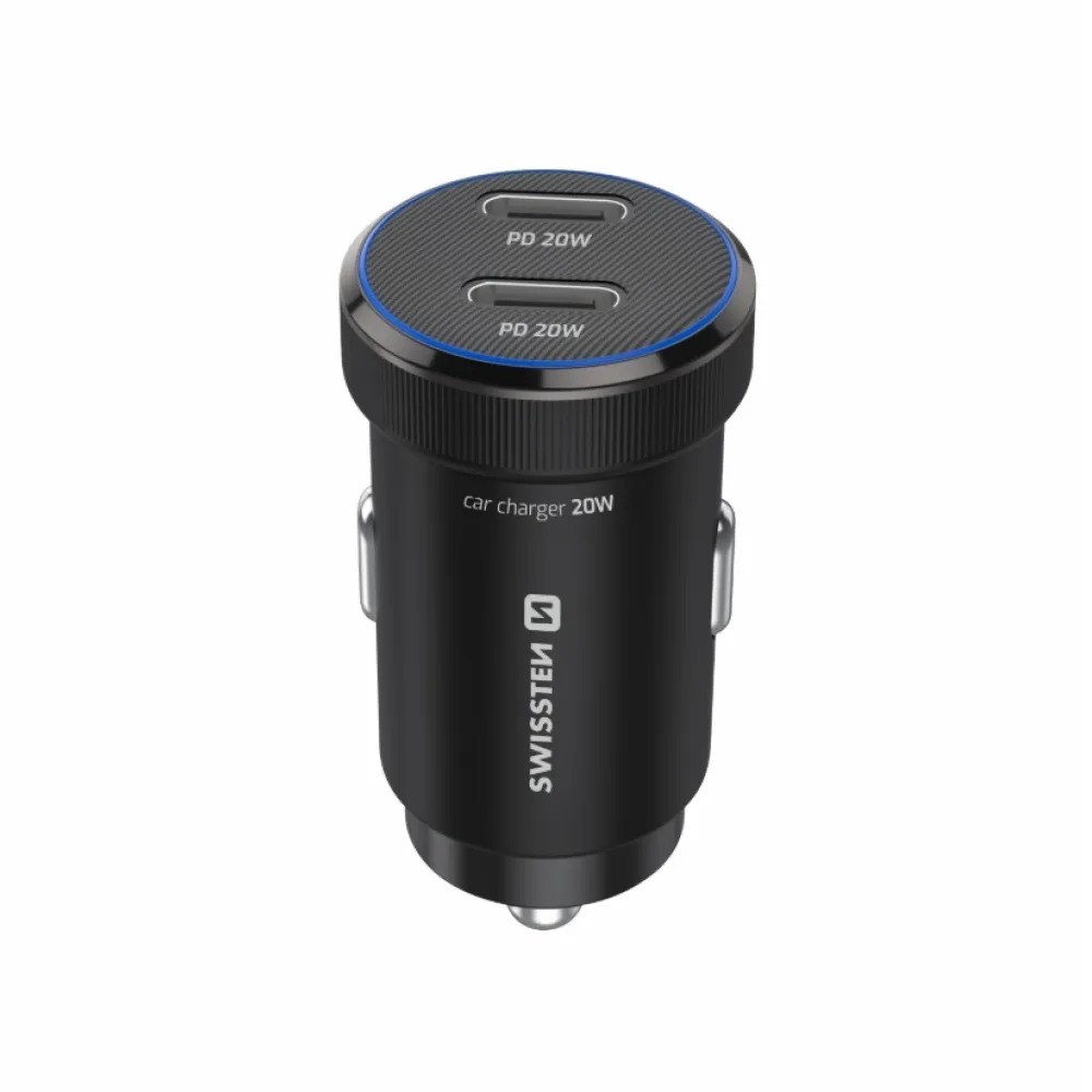 Praktická autonabíječka s dvojicí USB-C portů a podporou PD 3.0, dodávaná s prémiovým USB-C/USB-C kabelem (1 m, 60W, 3A, soft silicone). Modré LED podsvícení usnadňuje připojení i ve tmě.