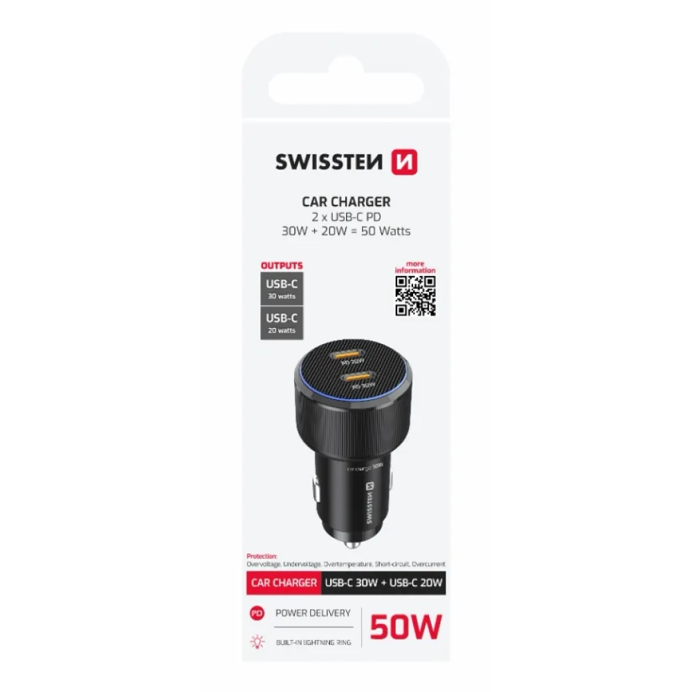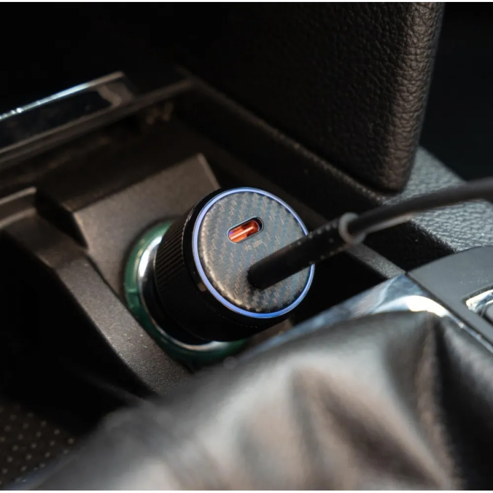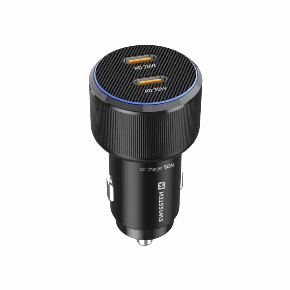 Výkonná a kompaktní autonabíječka s dvojicí USB-C portů a podporou PD 3.0. Umožňuje rychlé nabíjení dvou zařízení současně výkonem až 50W. Modrý LED kroužek usnadňuje připojení kabelů i při jízdě v noci.