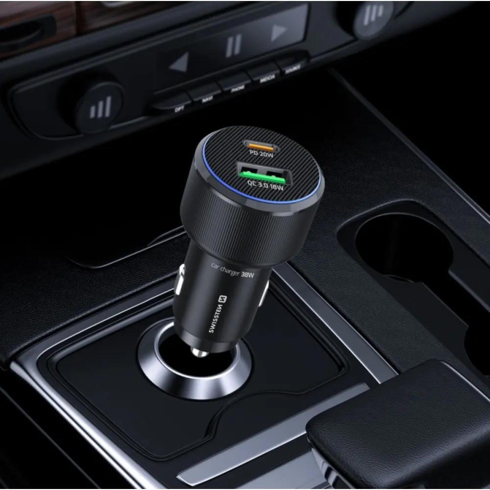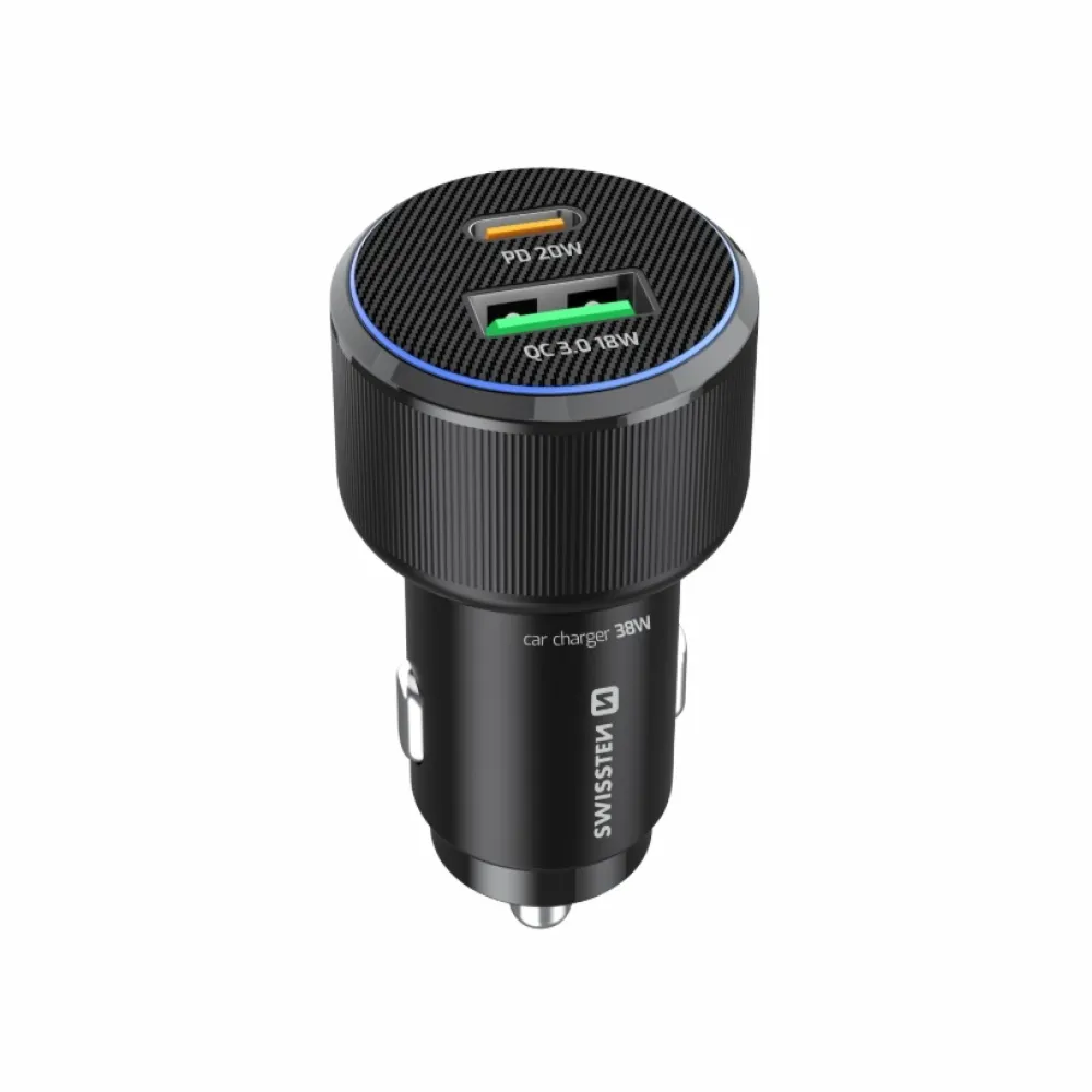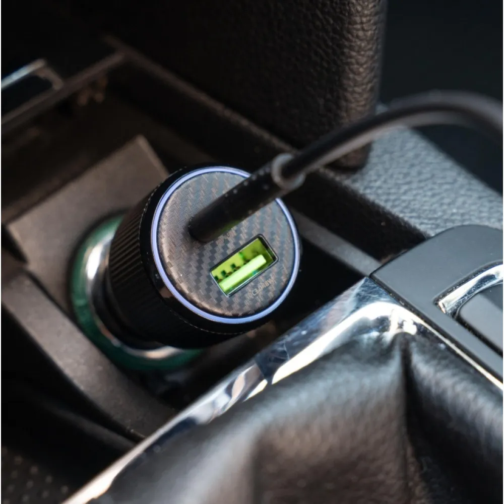 Praktická autonabíječka s podporou rychlého nabíjení PD 3.0 a QC 3.0, vybavená porty USB-C a USB-A. Součástí balení je 1m kabel USB-C/USB-C (3A, 60W, soft silicone) pro okamžité použití. Modré LED osvětlení v obvodu nabíječky usnadňuje připojení kabelu i při jízdě v noci.